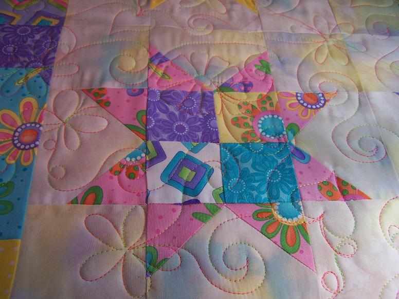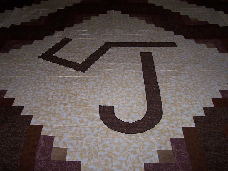 I have had a pretty productive weekend…I did my log cabin blocks to stay on schedule. And if you look at the countdown, you will see that I am now under forty to go! YEA!! I also added the first round of the last dark logs on my cousin’s blocks. I did housework and laundry, as usual. I worked on the binding of a UFO that’s been hanging around for about 2 yrs. I know that I can’t finish my starry log cabin by the end of the month, but I want to participate in the UFO challenge on MQR, started by Lynn. I also basted two baby quilts for a customer, who wants to embroider and quilt them herself, but hates basting.