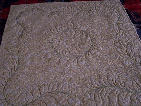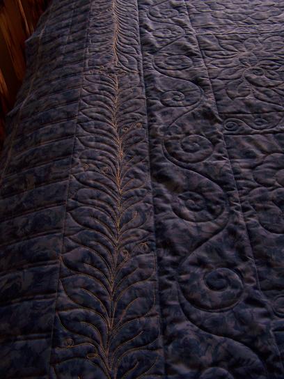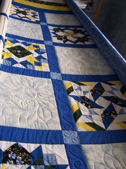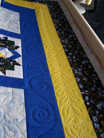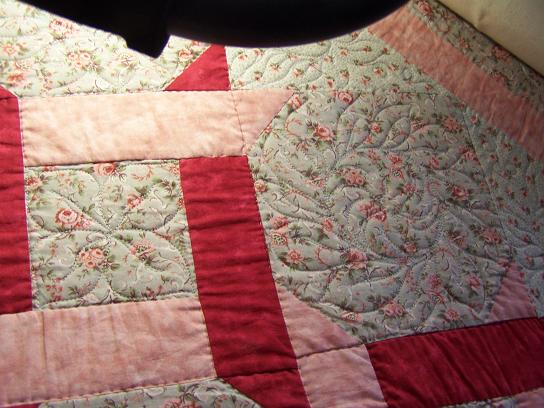 This is the quilting in progress, of the customer quilt I mentioned yesterday. The quilt was completely finished, with stitch in the ditch hand quilting. After machine quilting another quilt for customer, she decided she would like me to try to add some quilting to this one. I knew it would have some challenges, but except for problems with the borders, I think it’s coming along nicely.