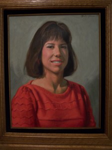 I think the colors are actually prettier in person, than in the photo. It doesn’t really have that yellowish color in real life. When I was in college, Mr. Adams, the artist, taught art there. One day, he asked me if I would sit for a portrait for him, and he offered to pay me for my time, in money or a small portrait. Even in my youth, I was smart enough to tell him I wanted the small portrait. I gave it to my parents as a gift. This is a photo I took of it.