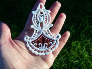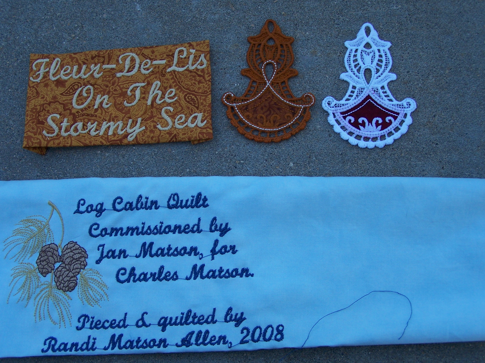 The ornament is still wet, from rinsing out the stabilizer, but when it’s dry, it will be the same color as the label it is laying beside. Also in the pic, is the label for Daddy’s quilt. I still need to trim it up.