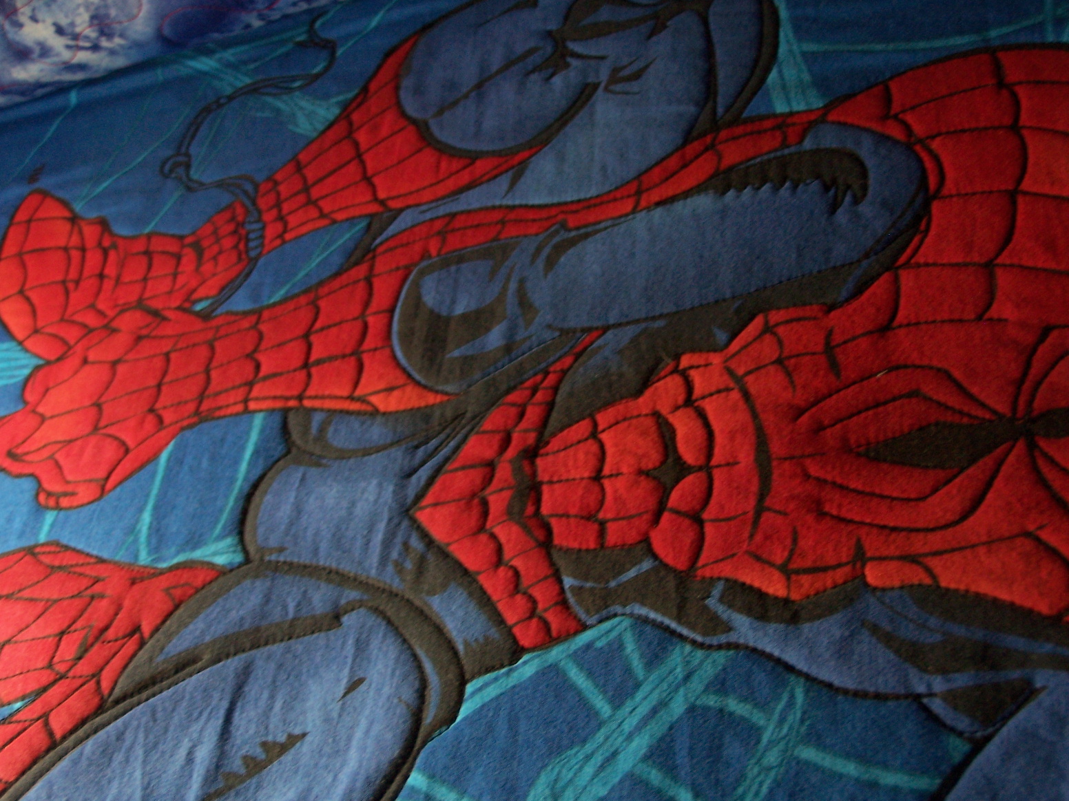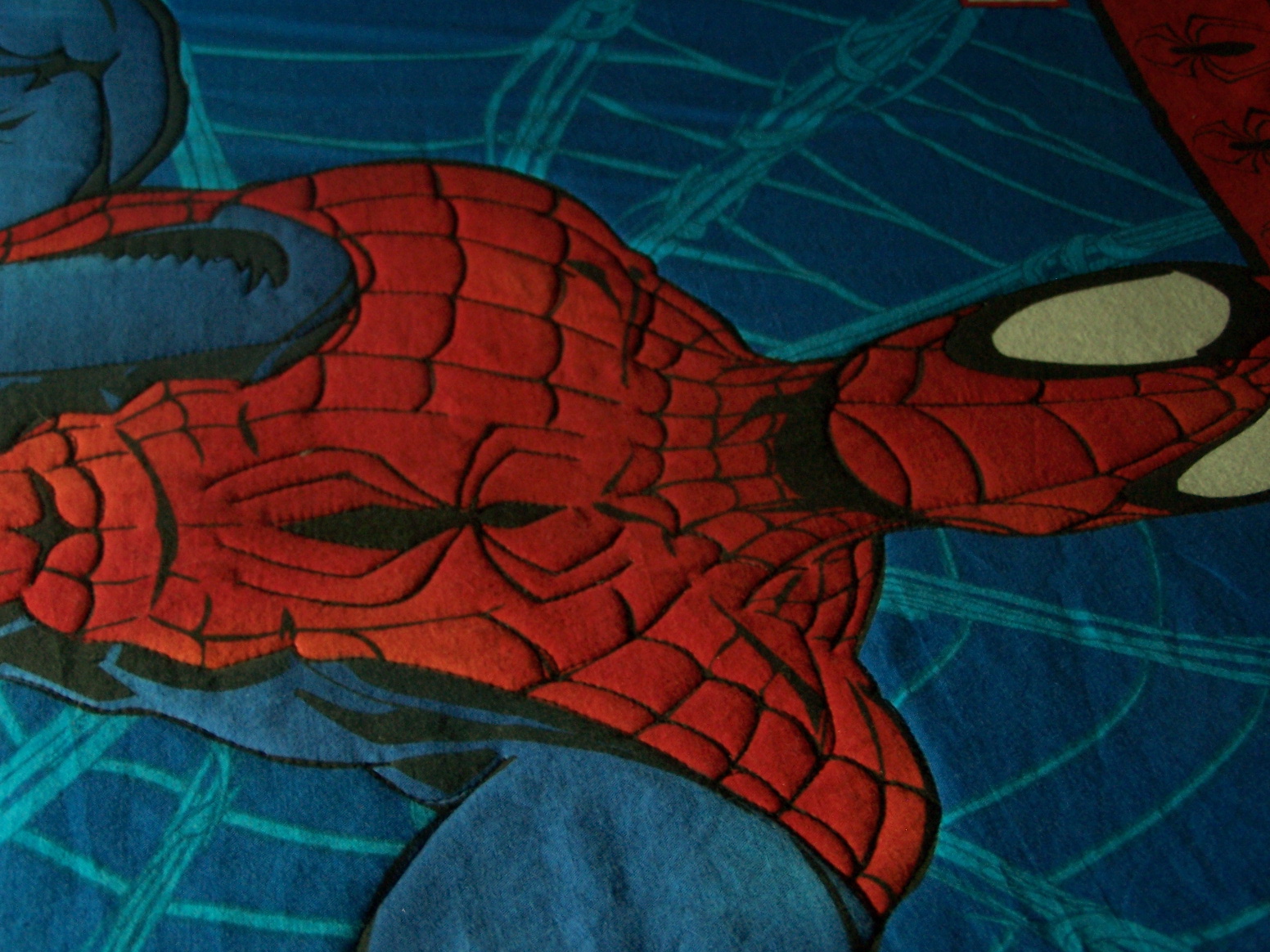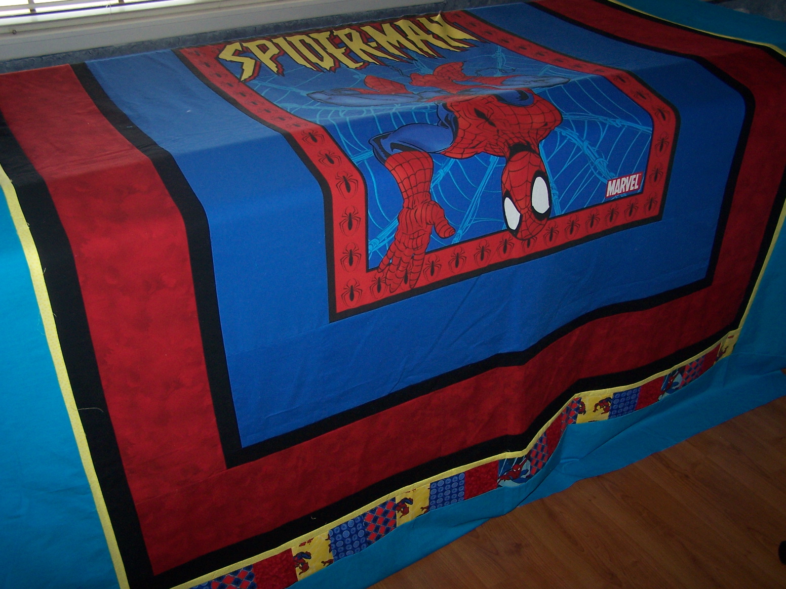 I decided to do a bit of outlining on Spiderman, and will quilt on the webs behind him, in the center panel. I still have some outlining to finish, and I think I will connect the spiders with a wave black line.