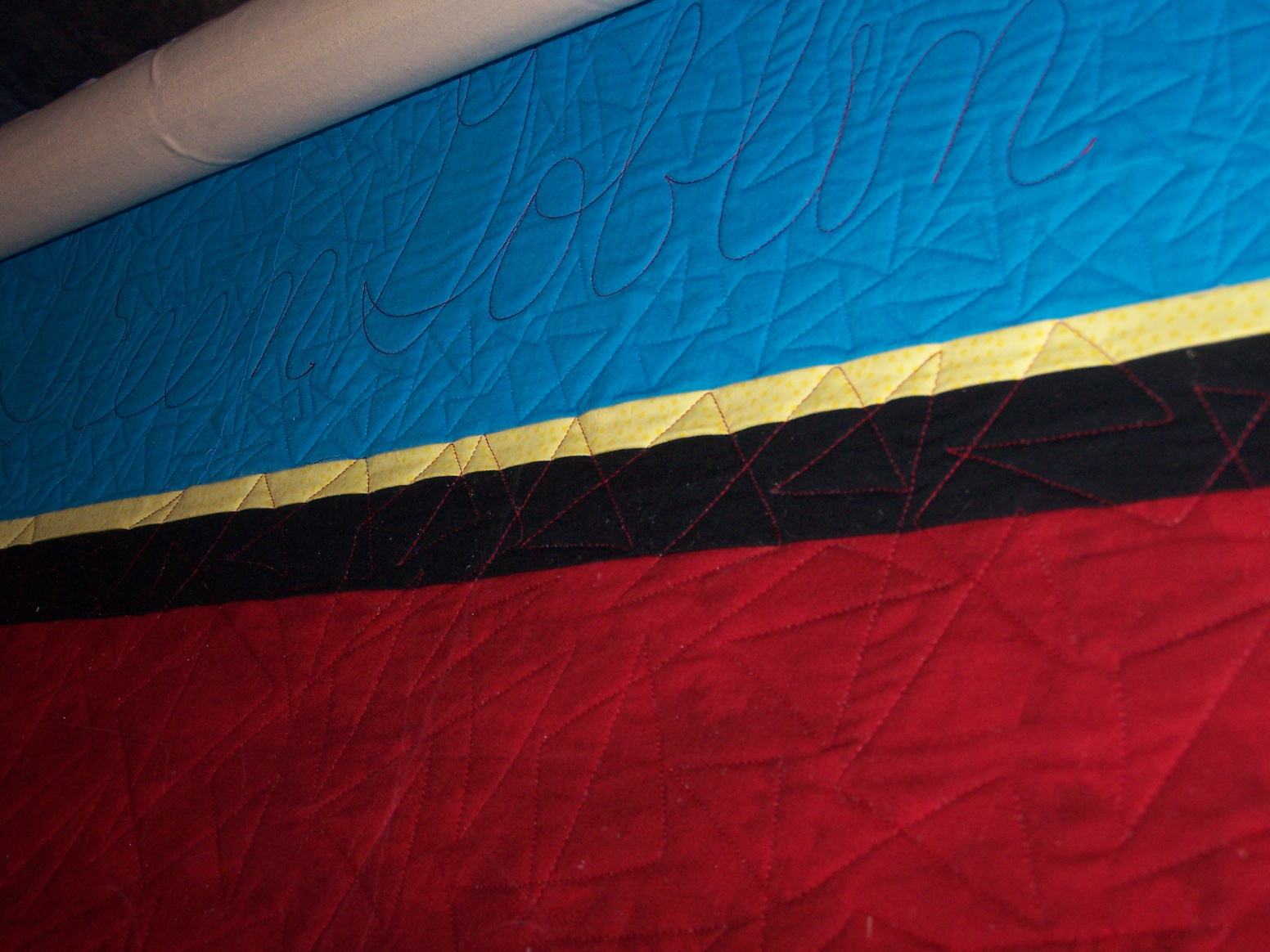 Still working on Spiderman. What I thought was going to be “light custom” is taking me much longer than I expected. This is part of the longarm learning curve I am still trying to get around, determining what quilting goes in which pricing level. This one is much more time consuming than I had envisioned it. But live and learn. I find these kind of quilts quite challenging to begin with, and I just hope my customer likes how I have decided to quilt it. I am quilting word related to Spiderman, and the child’s name in the outer borders, along with some spiders, and then just an angular meander around that.