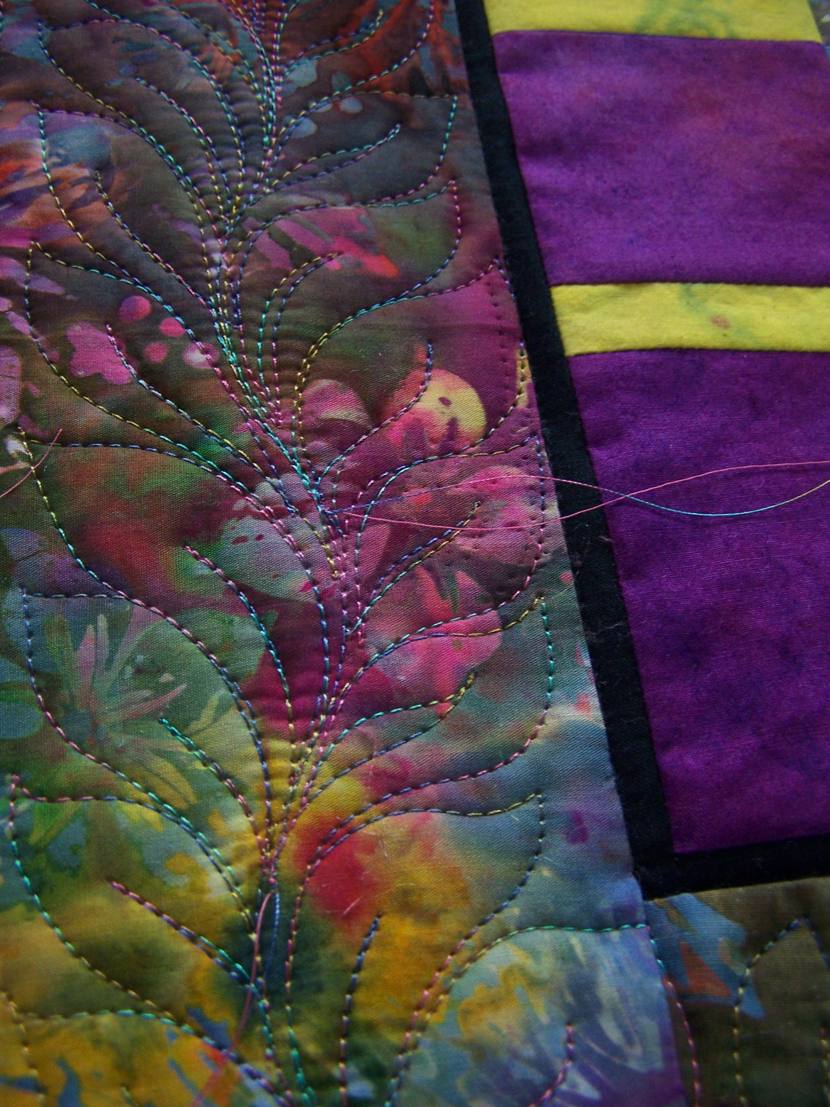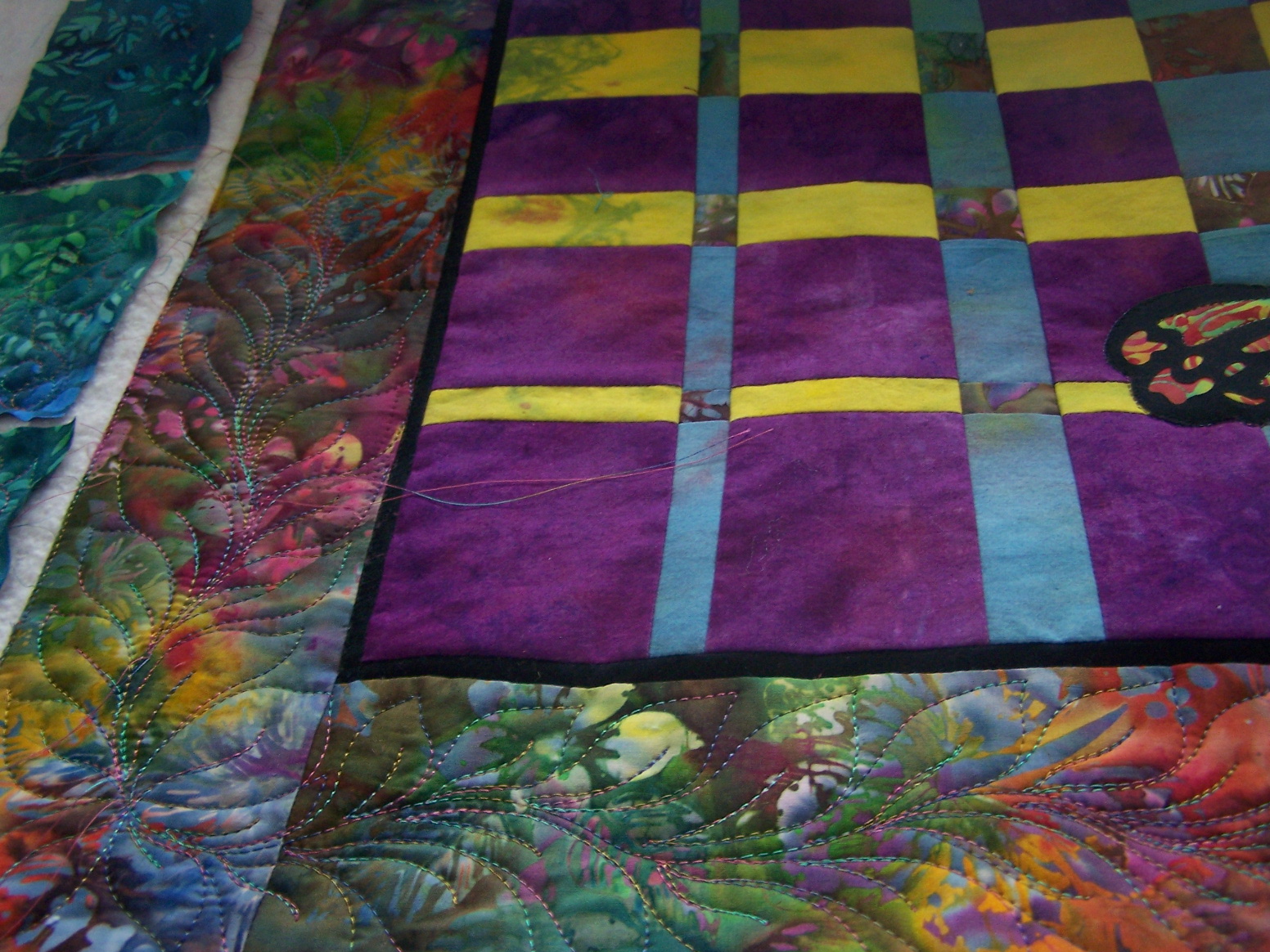 Or so it seems. I had hoped to be further along on this by now. Of course, I haven’t worked only on it this weekend. I’ve done laundry, shop statements, and various other household chores. This is all batiks, and I’m using Rainbows thread, so I’m going slowly and carefully. Of course, outlining those butterflies took a fair amount of time, and I’m tying off and burying all my thread tails. I did SID in the black border, and am doing a leafy vine in the outer border.