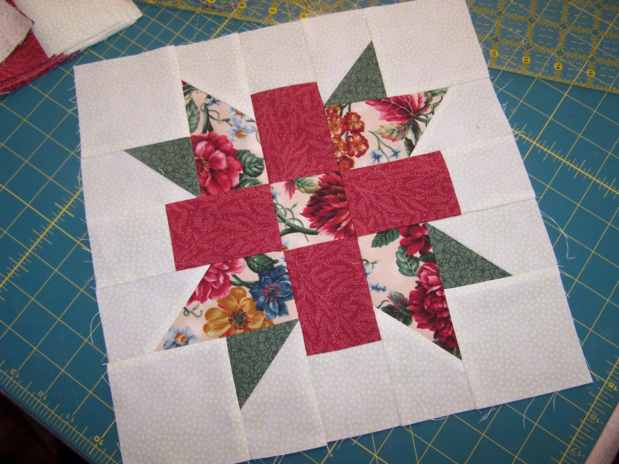I don’t have the last 8 star blocks sewn together yet, for the Gracie’s Star, but I do have the pieces all cut out, so I’m going to mark that fabric as busted. 12.5 yds out this week. I still haven’t decided if they are going together in the original pattern, or if I will separate them into two different quilts. We’ll see. I was hoping to make more quilting progress on my 9P & stripe quilt, and, had I not screwed up on the swag quilting, I would have. Somehow, I got off center with it, and didn’t catch it til I had almost the whole border of it stitched. I got to the right bottom corner and I was not ending in the right position. And way too much off to fudge a bit. So, any significant time spent on that this weekend was frogging. Yuk. But I got it done, and now I can get back to quilting, when I can find some more time. Today, I did pieced four more Gracie’s blocks, and put together a block from the final instructions for the mystery quilt I’m making. Hmmm…I’m not in love with it, but oh well. Not sure what I’ll end up doing with these blocks, either.