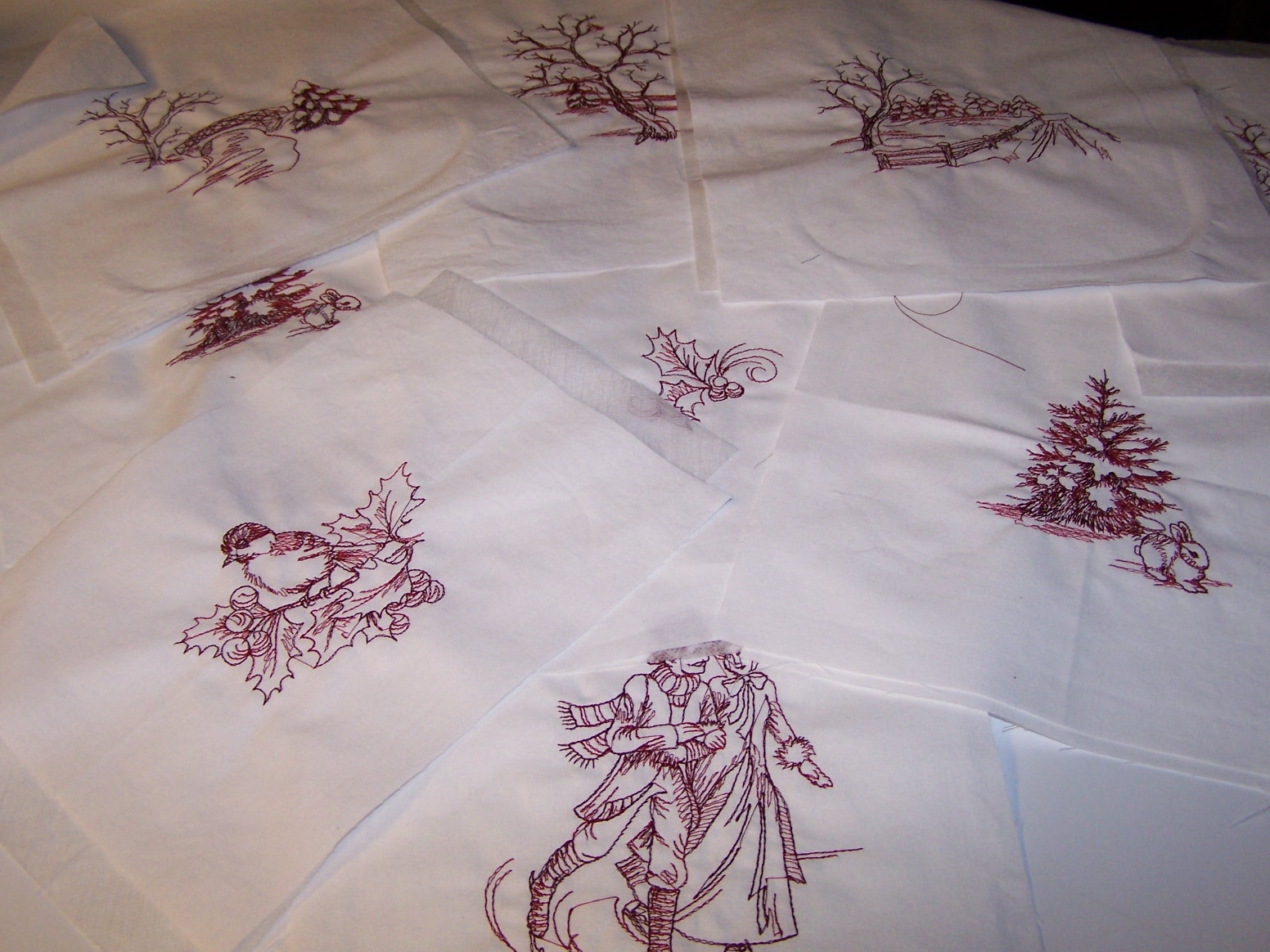 While I was sewing Gracie’s Star together, and while I was piecing on the above quilt, I worked on my leaders/enders quilt, Oklahoma Backroads, and I had my embroidery machine running, cranking out some blocks for a red & white Christmas quilt.