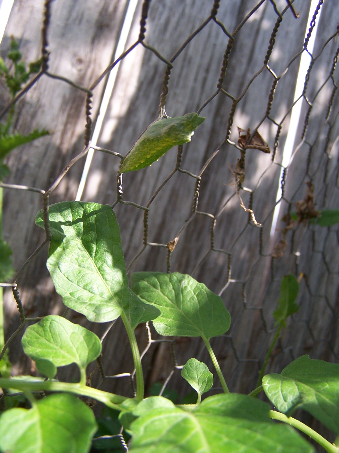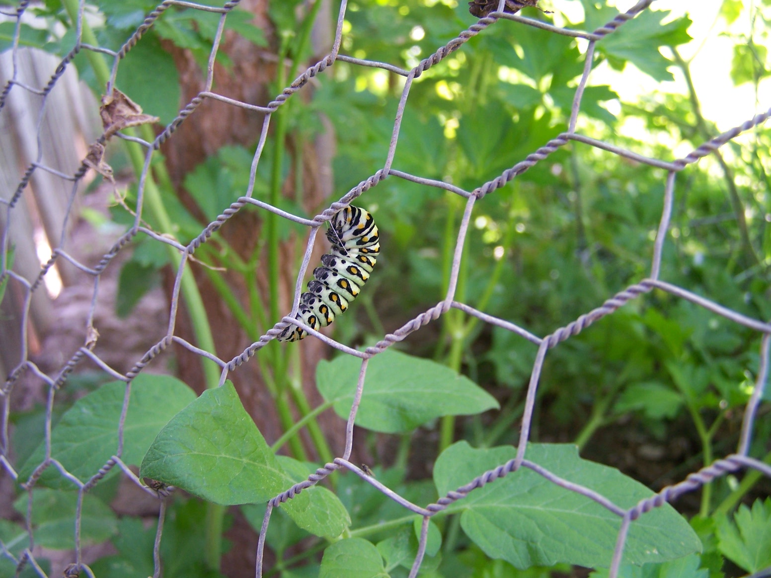 I haven’t posted any caterpillar posts on my blog, in quite awhile. However, if you put “caterpillar”, “swallowtail”, “butterfly” or “butterflies” in the search box in the upper right corner, you will find several older posts with lots of pics of the black swallowtail butterflies and caterpillars, that I like to watch in my yard. I plant dill and parsley for them every year, and I get lots of caterpillars. However, I had never been able to find one making it’s chrysalis. Until today!! I have had some trouble with birds finding them, and when they do, they just wipe out the whole lot of them. So, when I found this last batch on my parsley, I put some chicken wire over them to keep the birds out. I also hoped that they might use it to attach themselves to, when they were ready to make their chrysalis. Nope, they’ve been crawling off somewhere else. Yesterday, Greg noticed a smaller one hanging on the underside of the wire. It’s a smaller one, so I thought maybe it was just hanging there to molt it’s skin. I checked on it this morning, and it was still there, and I thought I could see a strand of silk looking stuff. So, I took some pics, just in case. These were taken before we left for Sunday School. Oh, if you click on the pictures, they will pop up in their own window, and then you can click them again, and see them really close up.