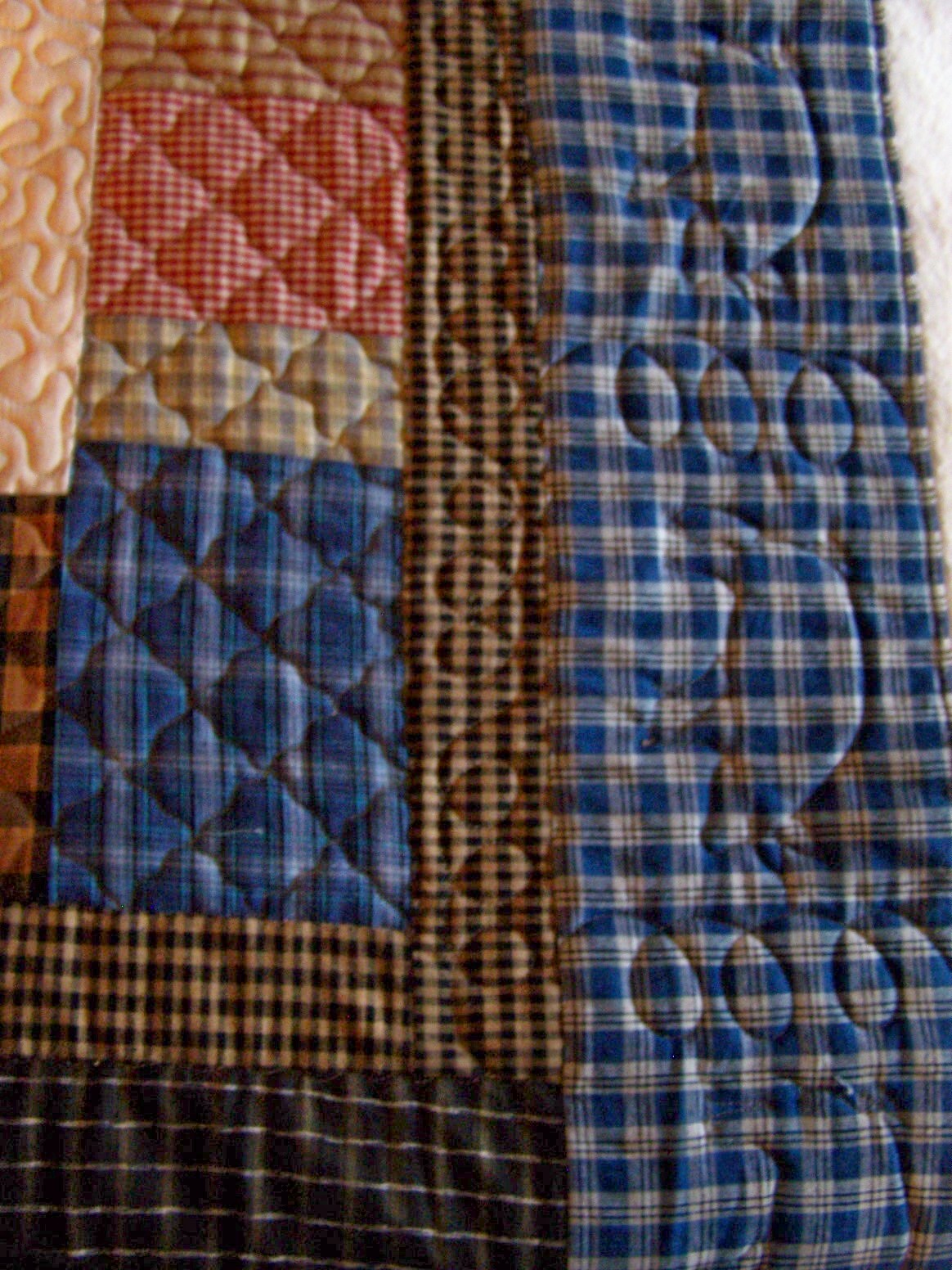 And then, when I went to bed, I took my 9P & stripe quilt with me, and worked on knotting and burying some of the thread tails I left on it. I should have done it while I was going along on it…now it feel like I will never get them all done. 😦 I’m glad I decided to go back to a backtack before I finished. And I still have to bind it!