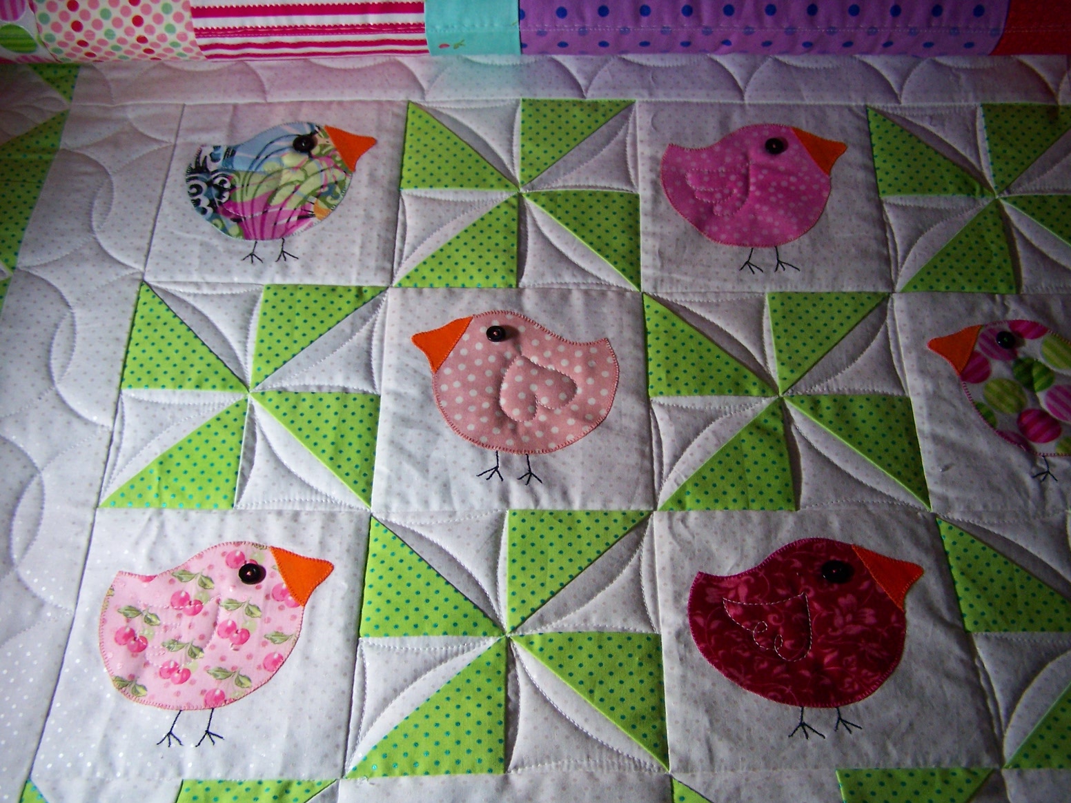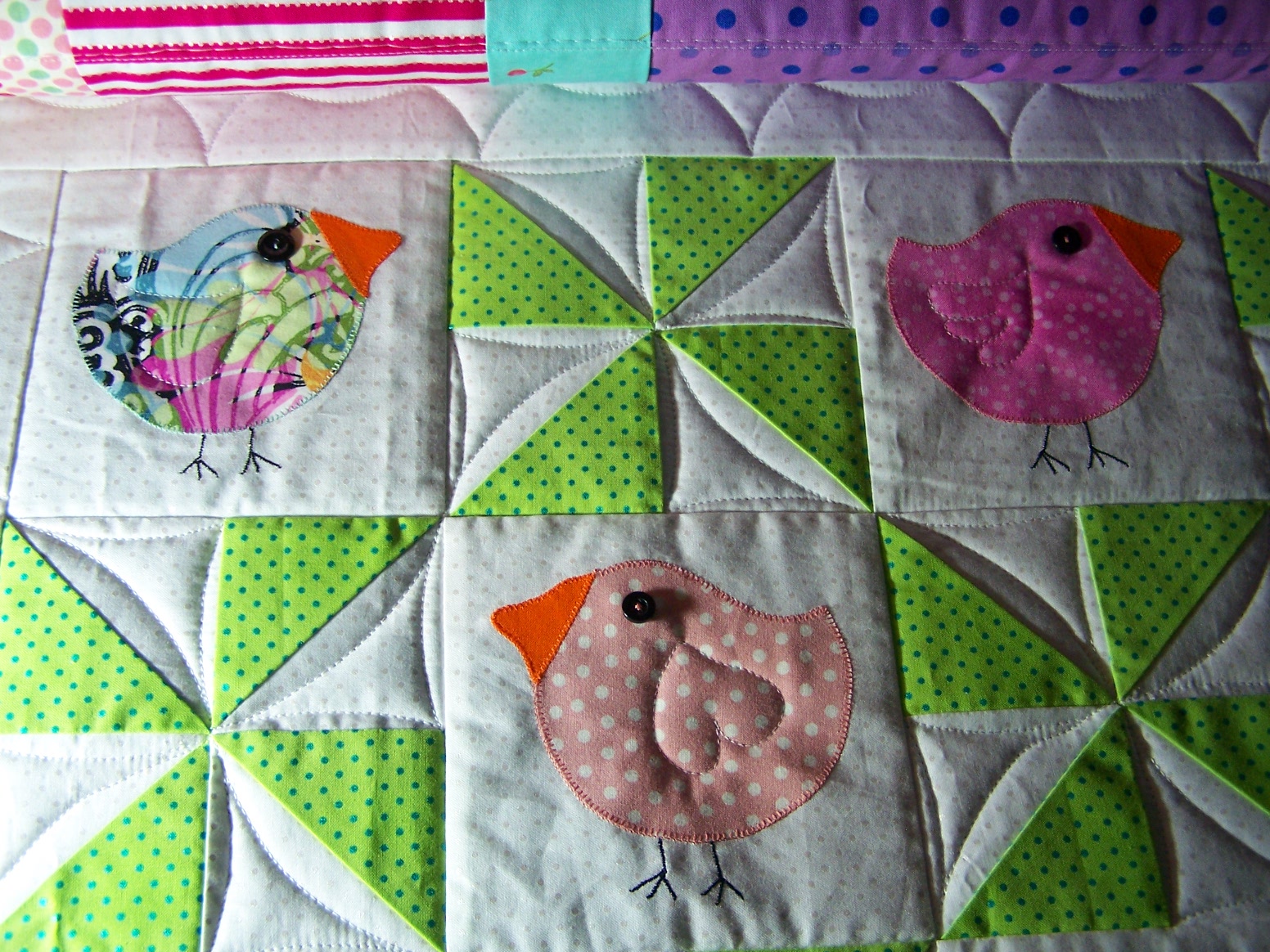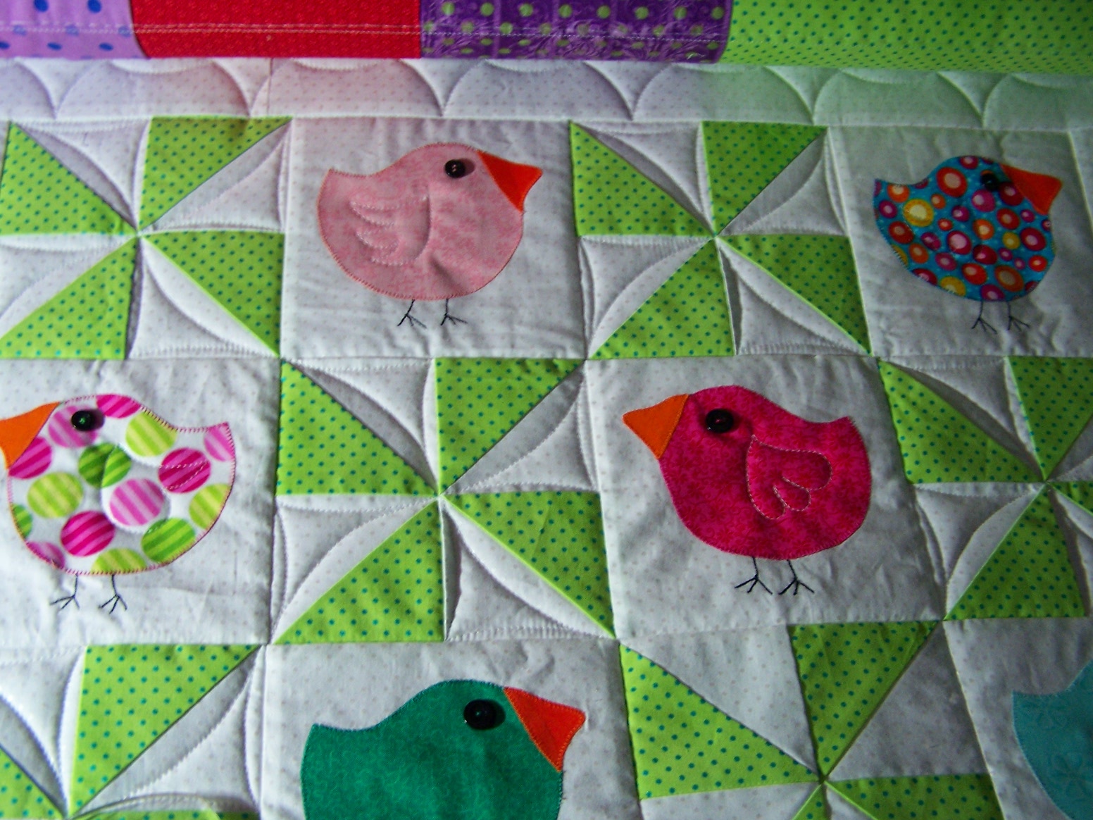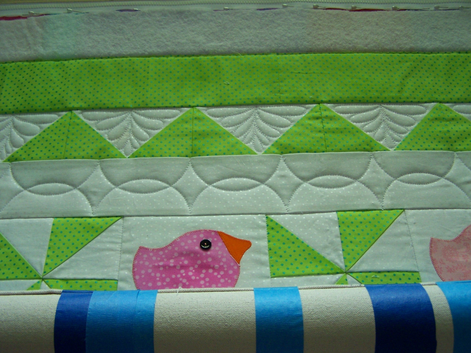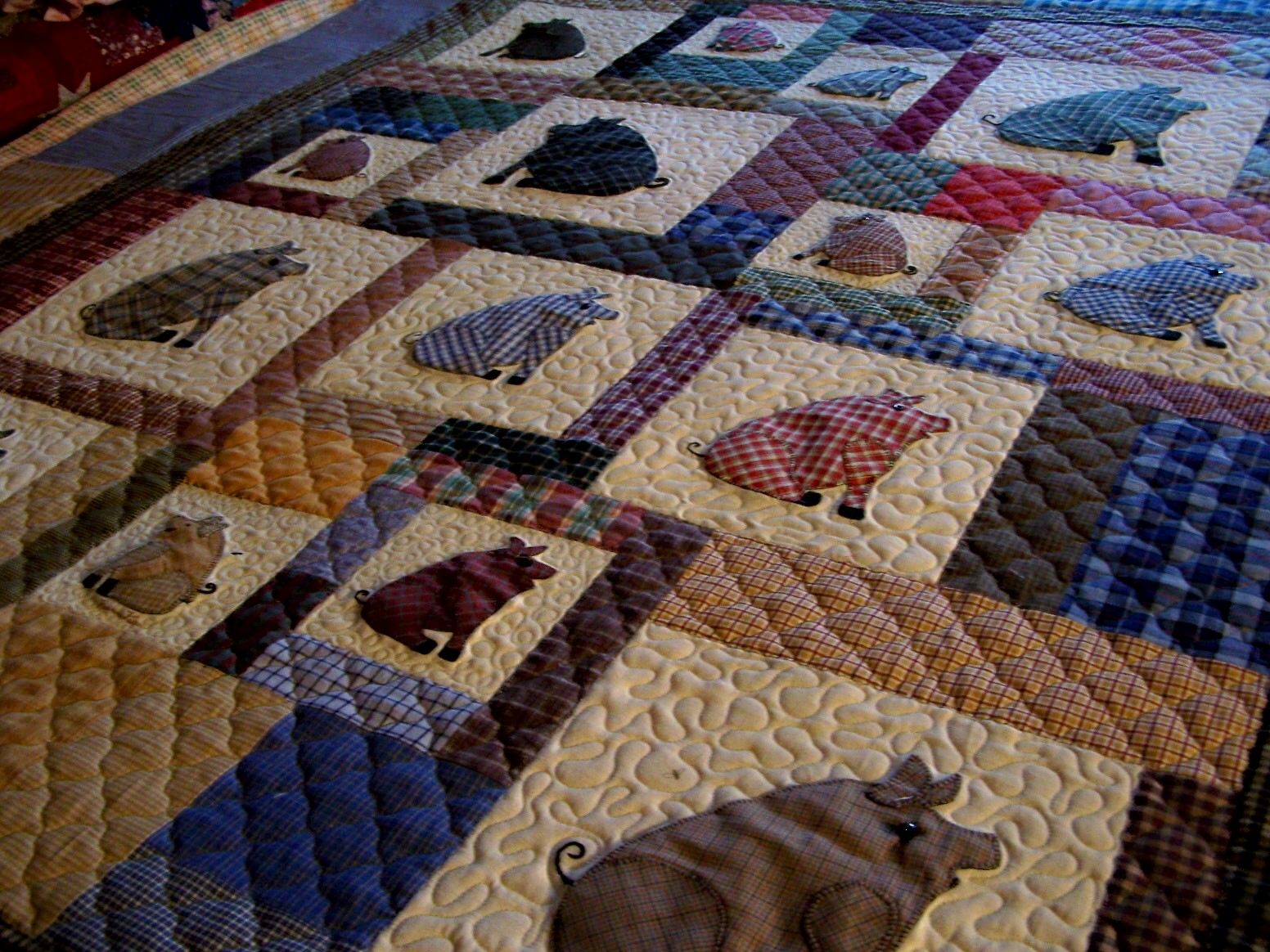 Speaking of customer quilts…the next one in line is soooooo cute! It is appliqued “Chubby Chicks” in cute colors. I will enjoy working on it. I will be blogging it, so it’s owner can check in on it. I just hope I do it justice! Right now I am quilting appliqued pigs. I really started second guessing my quilting choices a little over halfway through, and had a mini meltdown. I took it off the machine to turn and repin it, so I could quilt the last two borders more easily, and took a some pics before I put it back on. I think it helped to be able to step back and see the whole quilt at once.