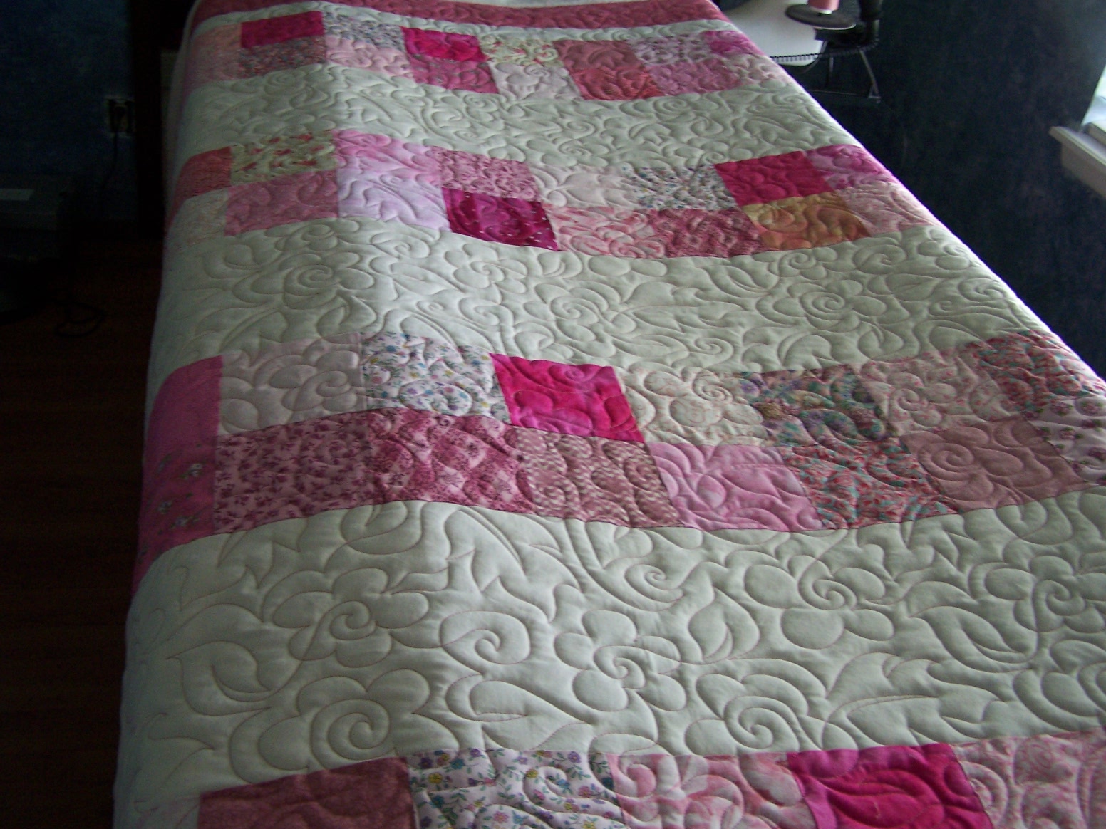 Friday afternoon my Mom called to tell me a dear friend of ours has been diagnosed with breast cancer. And, being the quilter that I am, I ran straight to my stash. Oh yes, she must have a quilt! I had a stack of 5″ pink charm squares, and this is what I did with them. Started on this yesterday morning, by early afternoon today, it was a completed flimsy. I can’t wait to watch it be transformed by the quilting. I’m hoping to squeeze it in, for a quick panto, between the customer quilt that is on the machine, and the next one in line, so I can get it bound, labeled and off to our friend. I am going to estimate that I busted 4 yds in the top. No new fabric in this week.