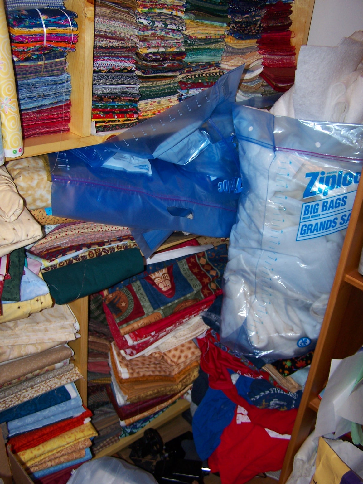 This is more fabric, and my magazine stash, and the very bottom box is more fabric that I have set aside for two different quilts I plan to make. Someday. One is a chicken theme quilt, and you can see the rooster fabric in the box, that I plan to use for backing. Those two sacks there are full of fabric, also.