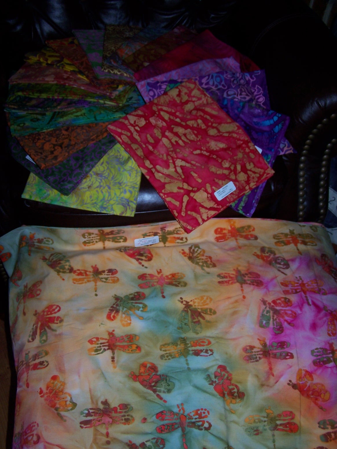 And, this was going to be in tomorrow’s stash report, but I may as well spill the beans now! When I’m bad, I’m very bad. 23 yards of batiks were delivered to my door today. It hasn’t even made it’s way to my stash yet. I’m just enjoying it’s beauty as it lays there in my chair and across my ottoman.