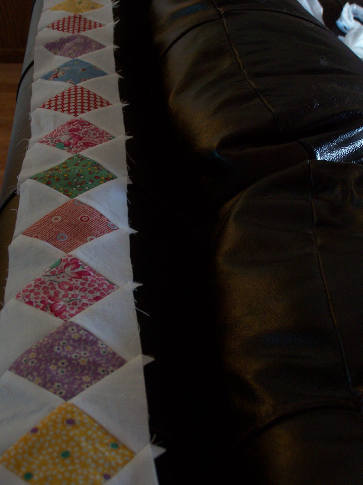 I made great headway on my Boston Commons. I have one more row like these, then adding white fabric around and between, a pieced border, and then I am going to add an additional plain border all around so I have some more space to quilt feathers in. The original pattern, which is by Darlene Zimmerman, ends with a narrow border of the the squares and white triangles.