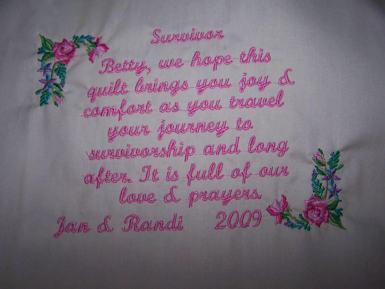 So now, back to stash reporting. After today, my stash amount busted is now back in the positive for the year. A whopping 4.25 yards! I busted another 4 yds. this week, backing the comfort quilt for our friend with breast cancer. I got the quilting finished on it today.