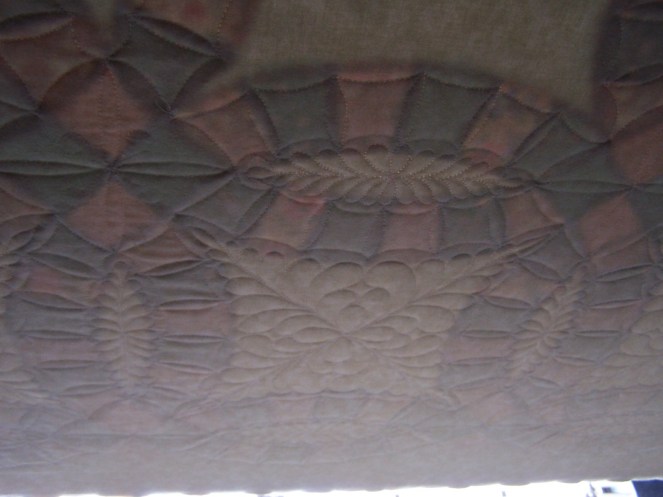 I am still doing the stabilizing (the continuous curve stitching) on Erma’s DWR, but I had to take a break from it and try out some feathers. The large feather motif is not a stencil. I drew it in and stitched it out, and am hopeful that I will be able to replicate it closely, over and over, as I go. I like it. I have two rows of the CC stitching done, seven more to go…so it will be a few days before I get back to feathers, or have anything exciting to share. 🙂 TTFN