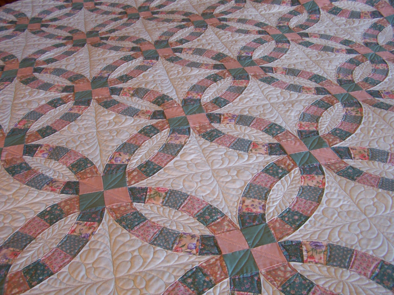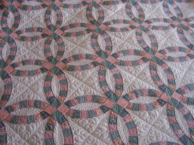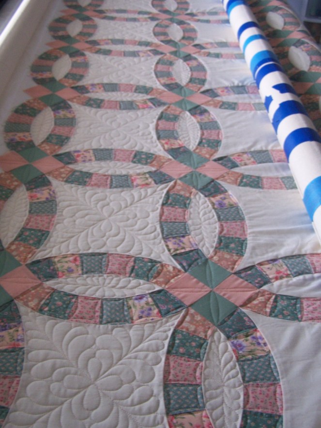 Lots of work on this one, but I think it was worth it. Erma, I hope you like it! No shots of the full quilt because this baby is big. This is all freehand work, So Fine thread and QD Request loft cotton batting.