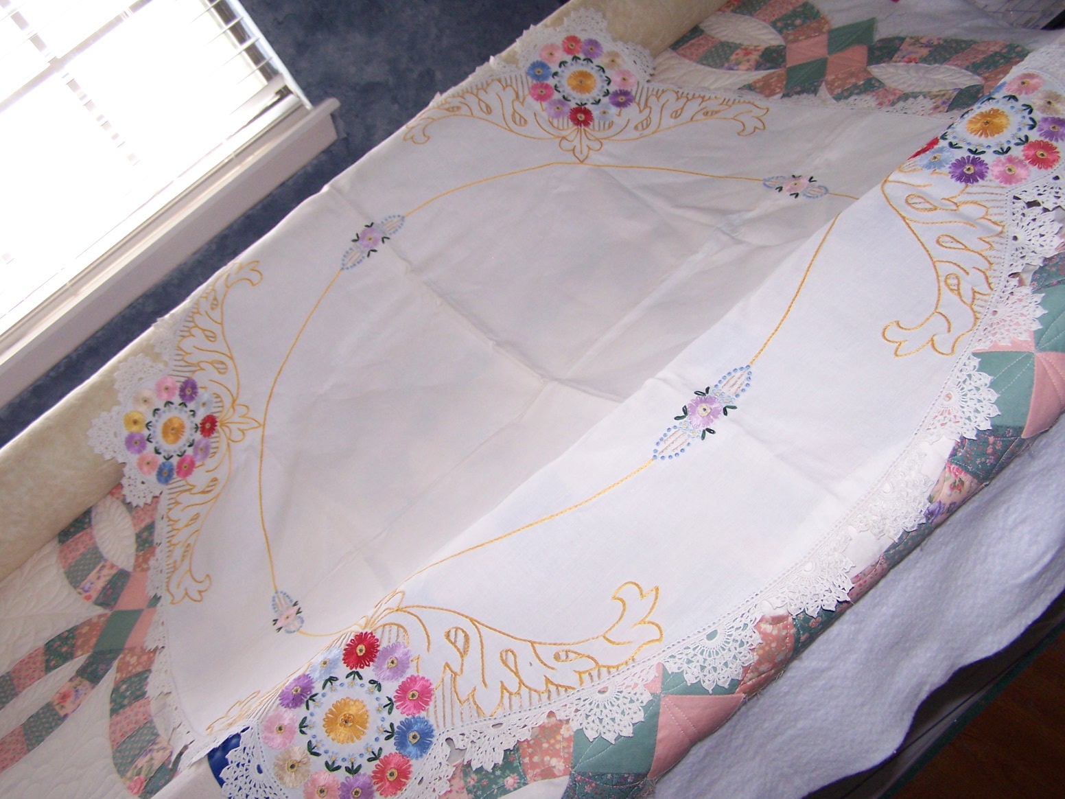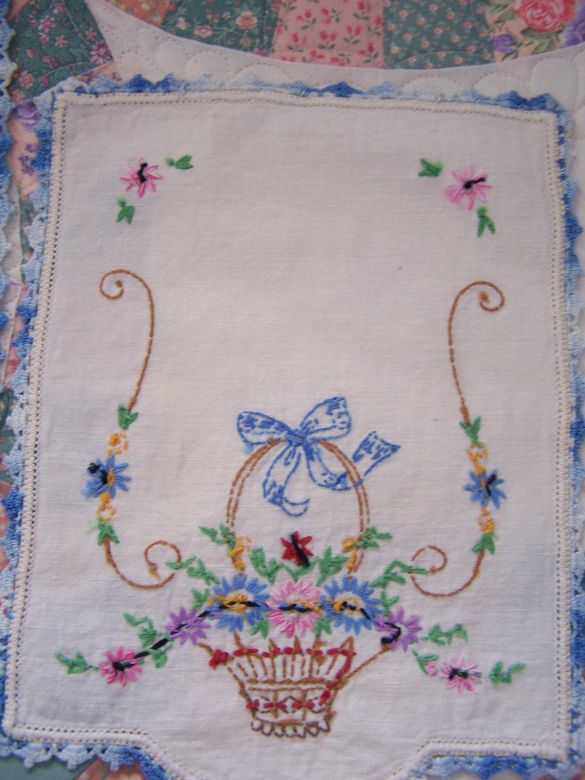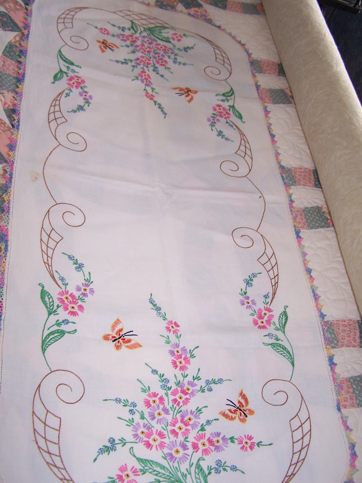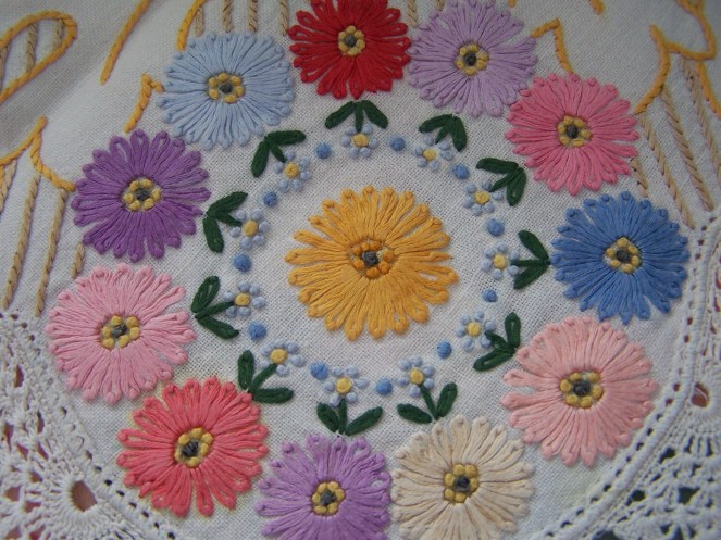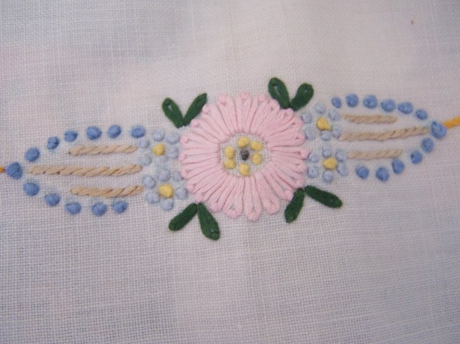 Soon, I will be finished with the DWR on the machine, and will have the finished pics of that to share with you. I have quite a little backlog of customer quilts waiting right now, so I have put aside my own projects for the moment, to stay up with that, as best as I can. But, in the meantime, I have some yummy, yummy eye candy to share with you. I want to show off some beautiful handwork, done by a woman that I never had a chance to know in this life. These lovely items were all done by my husband’s grandmother, Clara Woods Allen. I do not know when she made them…they are many years old. They have been stored in my husband’s parents house, in a cedar chest. My husband, his sister and brother worked on sorting through the items still left in the house, in order to get it emptied in preparation for selling. These are things they picked out for me to take home. I am so in love with them and feel so blessed to be able to enjoy these TREASURES. I love to look at the stitching, and imagine “Grandma Allen” working on them, and at times I am moved to tears by them. That might sound kind of silly, but that is how deeply I appreciate and value her handwork. I will love and enjoy them until it is time to pass them down to my stepdaughter, who will love them just as much. I am so thankful that I have been given the chance to love and treasure them in my life! And, I feel honored to be trusted with their safekeeping. Enjoy the show…and remember you can click the pictures to make them even bigger, and really see the details. I have several pieces to share, and will space them out over a few posts, rather than all at once, as posting takes me quite a bit of time, and I’m kind of short on that right now.