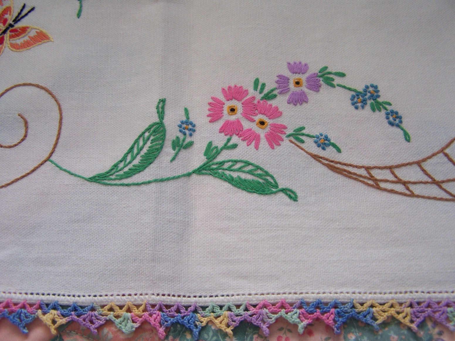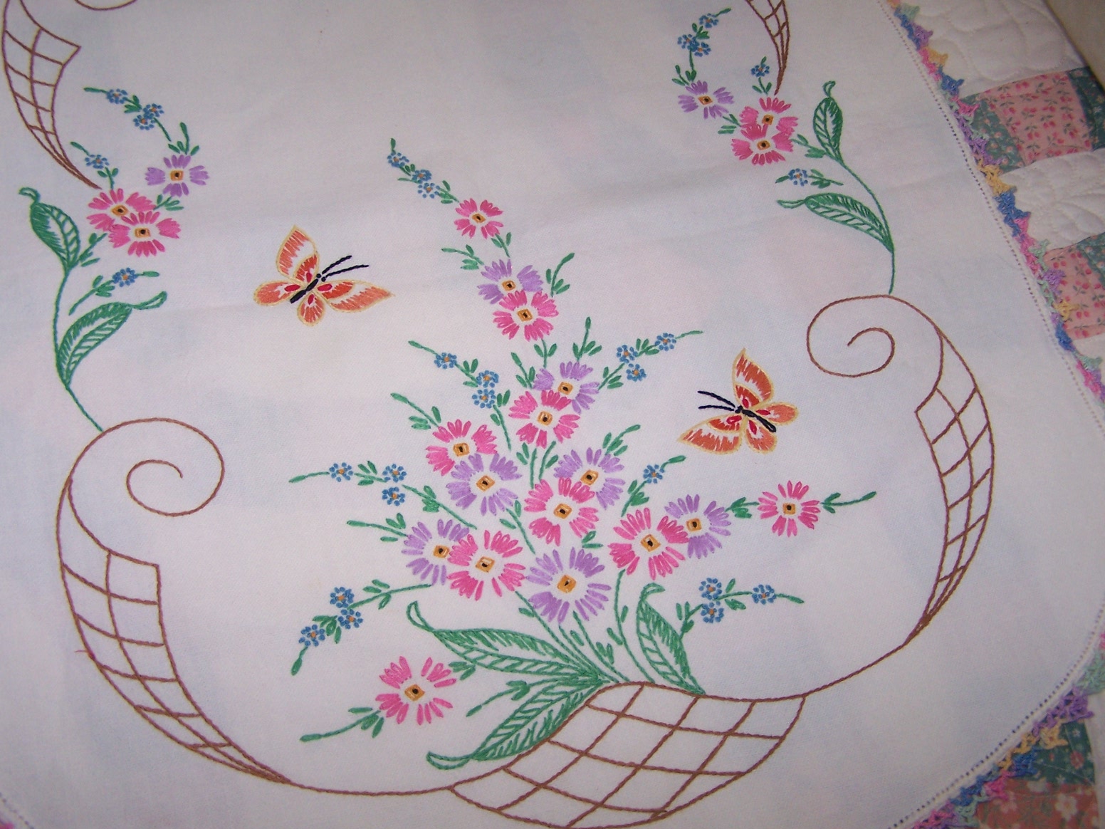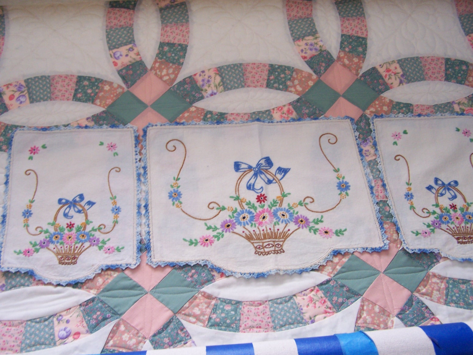 Soon, I will be finished with the DWR on the machine, and will have the finished pics of that to share with you. I have quite a little backlog of customer quilts waiting right now, so I have put aside my own projects for the moment, to stay up with that, as best as I can. But, in the meantime, I have some yummy, yummy eye candy to share with you. I want to show off some beautiful handwork, done by a woman that I never had a chance to know in this life. These lovely items were all done by my husband’s grandmother, Clara Woods Allen. I do not know when she made them…they are many years old. They have been stored in my husband’s parents house, in a cedar chest. My husband, his sister and brother worked on sorting through the items still left in the house, in order to get it emptied in preparation for selling. These are things they picked out for me to take home. I am so in love with them and feel so blessed to be able to enjoy these TREASURES. I love to look at the stitching, and imagine “Grandma Allen” working on them, and at times I am moved to tears by them. That might sound kind of silly, but that is how deeply I appreciate and value her handwork. I will love and enjoy them until it is time to pass them down to my stepdaughter, who will love them just as much. I am so thankful that I have been given the chance to love and treasure them in my life! And, I feel honored to be trusted with their safekeeping. Enjoy the show…and remember you can click the pictures to make them even bigger, and really see the details. I have several pieces to share, and will space them out over a few posts, rather than all at once, as posting takes me quite a bit of time, and I’m kind of short on that right now.
