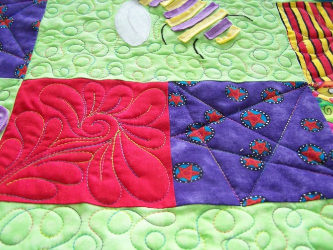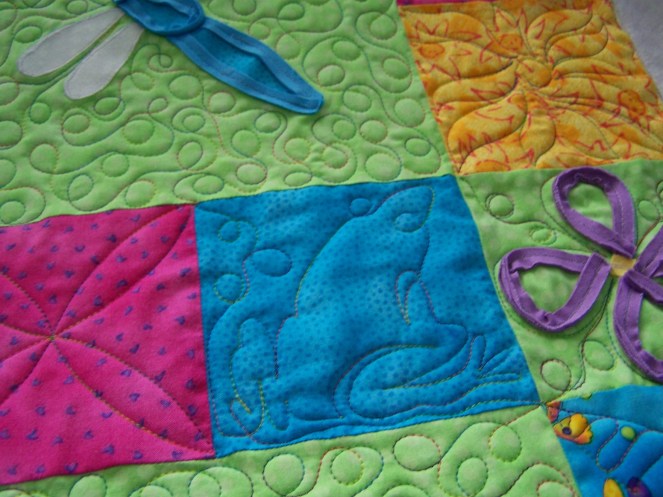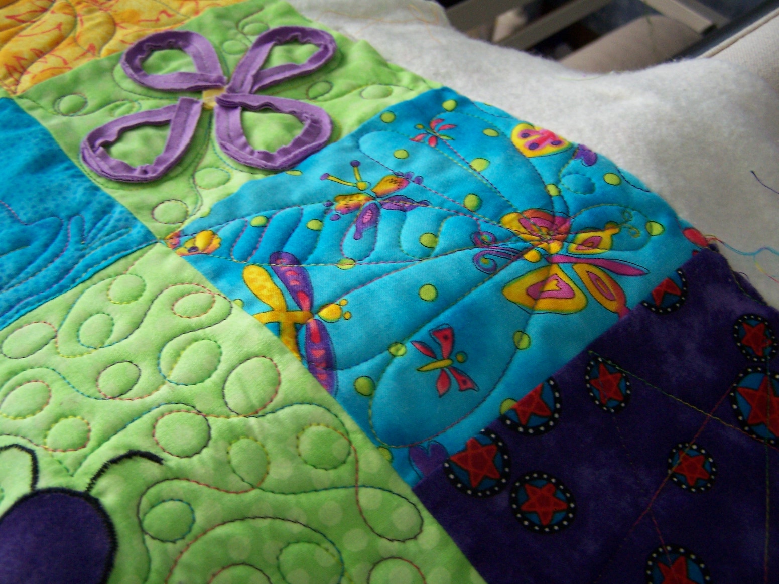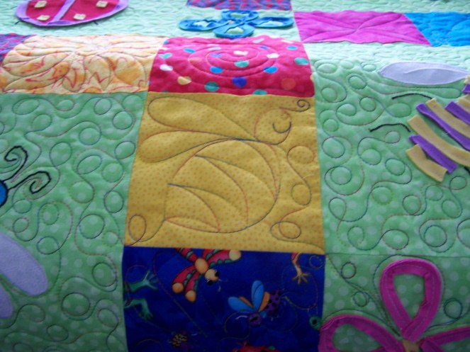 I do have a little quilting to share. I finished up a cute customer top last weekend. This one is for Thelma, and it is adorable. The bugs and flowers are chenille strips that she will “fluff up” after the quilting.