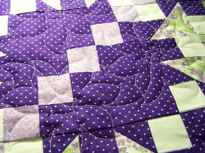 I stayed the night with Mom, in the hospital. I was surprised when I got home, that I still had energy left to do a little quilting on the client quilt I loaded yesterday. This is the first time I have quilted this panto, and I’m loving the texture, and the way the flowers seem to dance across the top. The pattern is Lorien Flower by Lorien Quilting. I think it is also an enjoyable pattern to stitch. No computerized system here…my quilting is completely hand guided. So, a nice flow to a pantograph pattern is important to me. This one has it.