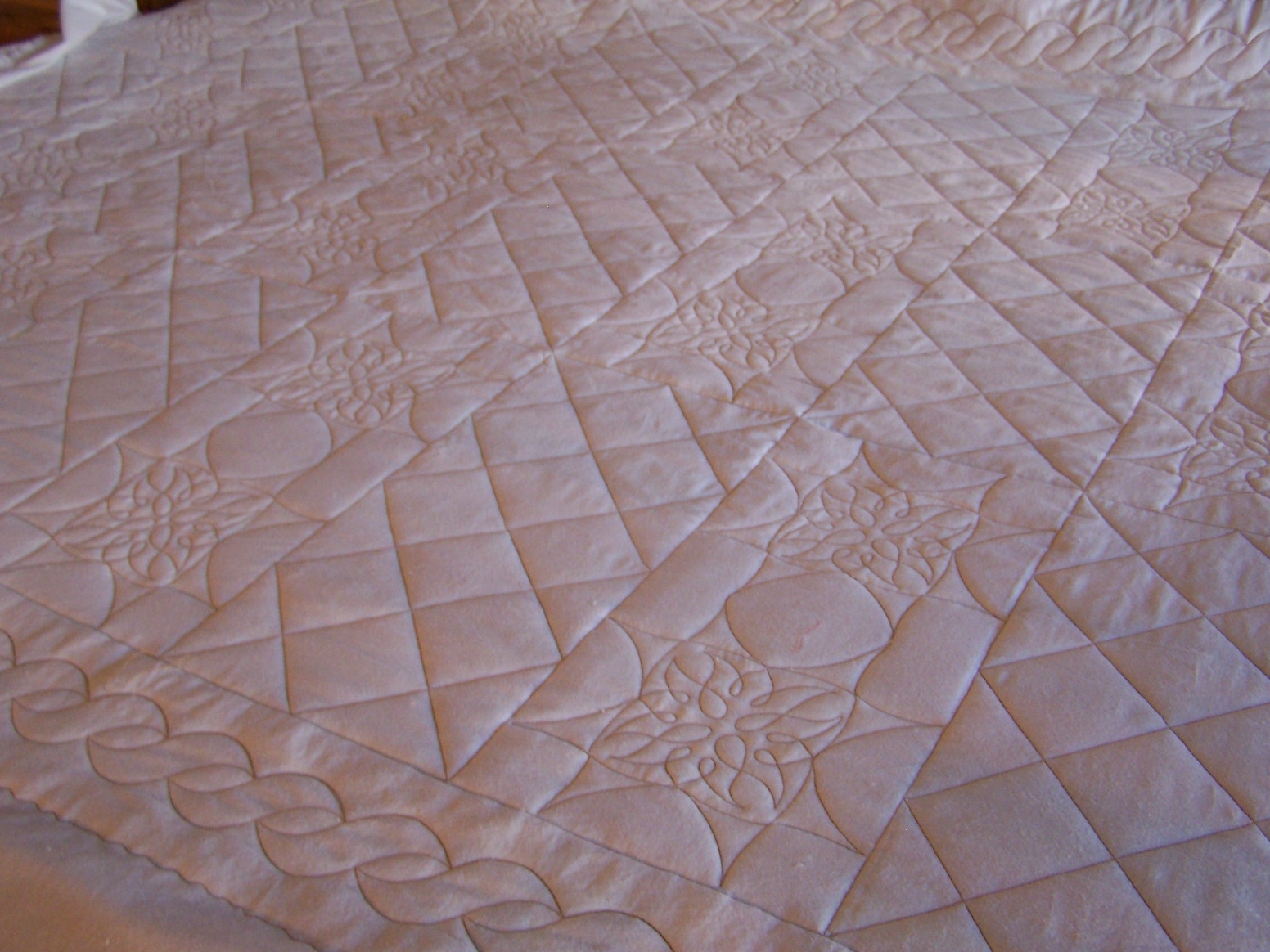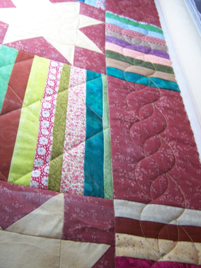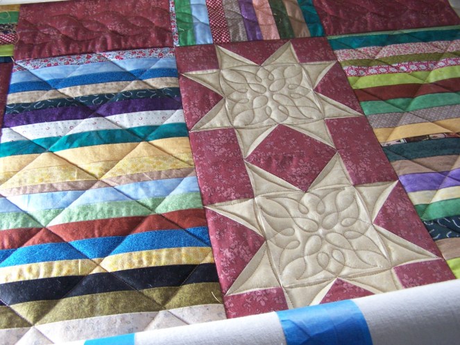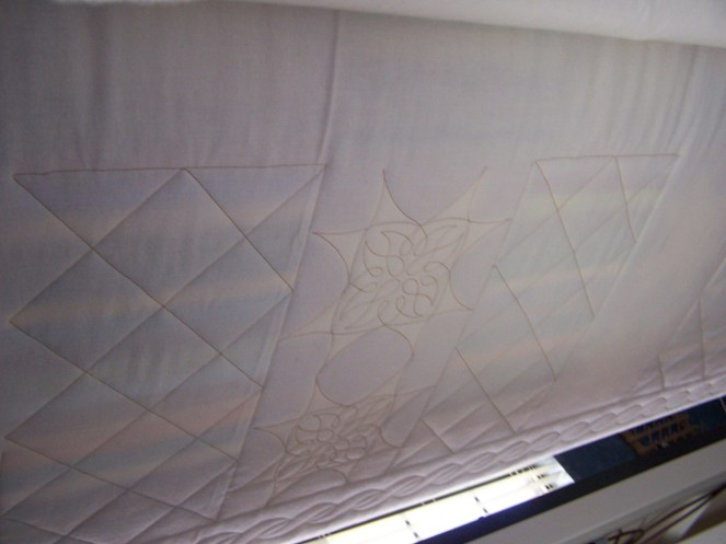 I also worked on Sana’s quilt, from the previous post. I have almost all the crosshatching finished, some more rope border done, and almost all of the SID. Once I’m completely finished with those things, I will go back and do the rest of the star blocks. I only did the first two, to make sure I liked the design. Then, I went back to the crosshatching and SID to get the whole quilt stabilized.
