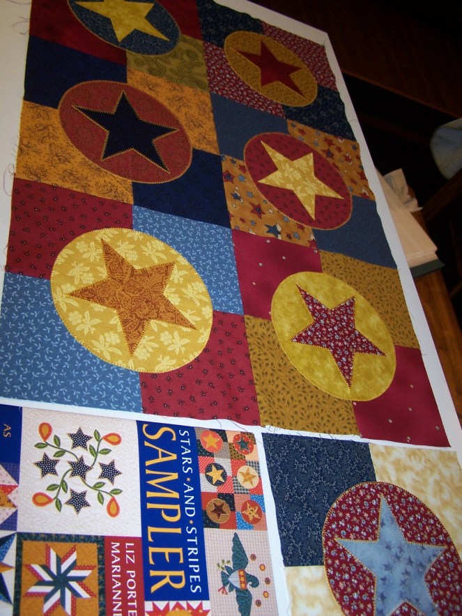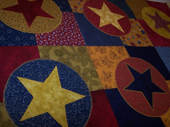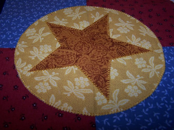 This was a fun block, once I got past the frustrati0n of learning to machine blanket stitch the stars halfway decently. The points really gave me fits to start with, and I don’t know that I ever got them “right”, but I’m happy enough with them.