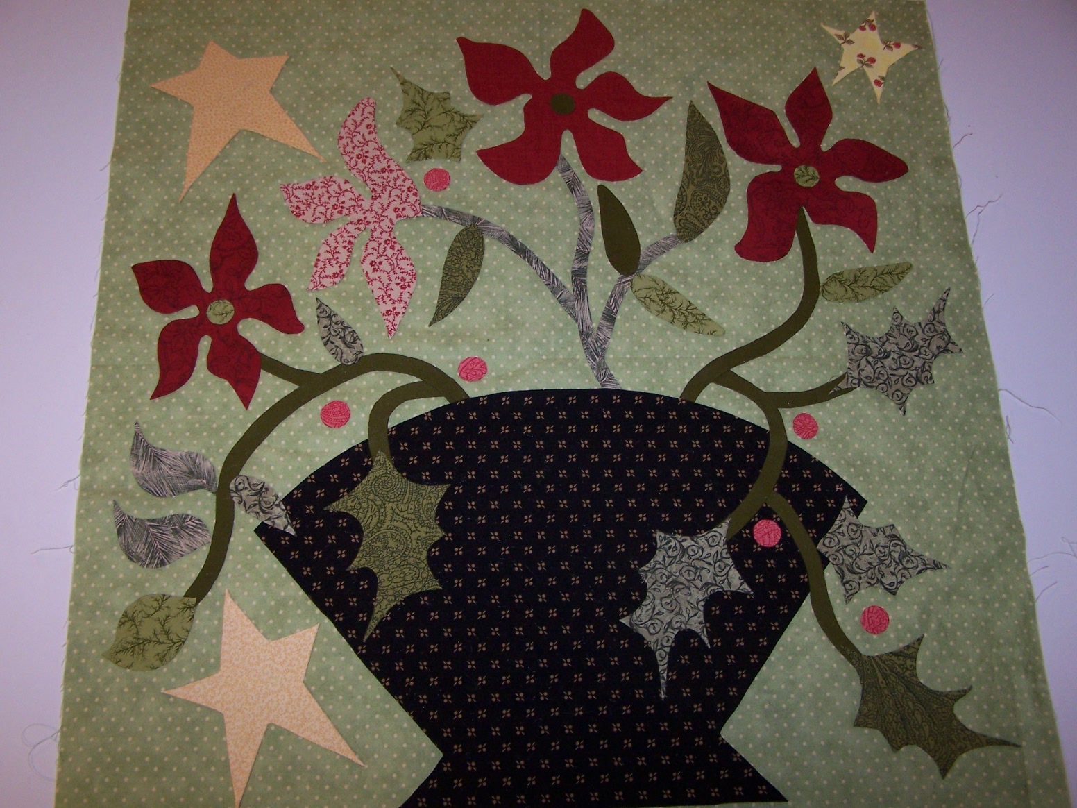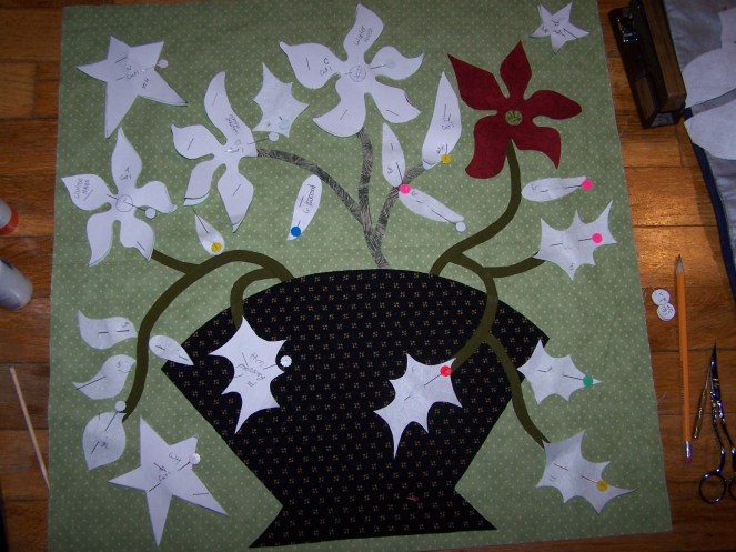 And, after all that…I treated myself to a little time to spend on an applique project that I have started. I found a yummy kit at Material Girls fabric shop in Borger, for a yummy quilt by Blackbird designs. I needed another project like I need another hole in my head…but…well, y’all understand don’t ya? I also discovered that the girls from Blackbird designs have a nice blog, too, called One Stitch At A Time. They even love the caterpillars that eat their dill and parsley, and then turn into swallowtail butterflies, just like I do! Their pattern is for needle turn applique, but the only time I tried that, I found it to be a very frustrating experience. Not my strong suit, at all. So, I’m doing it the way Sharon Schamber teaches in her book, Piece by Piece Machine Applique. It involves special wash away stabilizer and Elmer’s washable glue sticks and Liquid Stitch. I’m pretty slow at this, so I will probably still be working on this a few years from now. I hope I stay with it…I really like the quilt and want to finish it. I think it will be so much fun to quilt on my longarm!