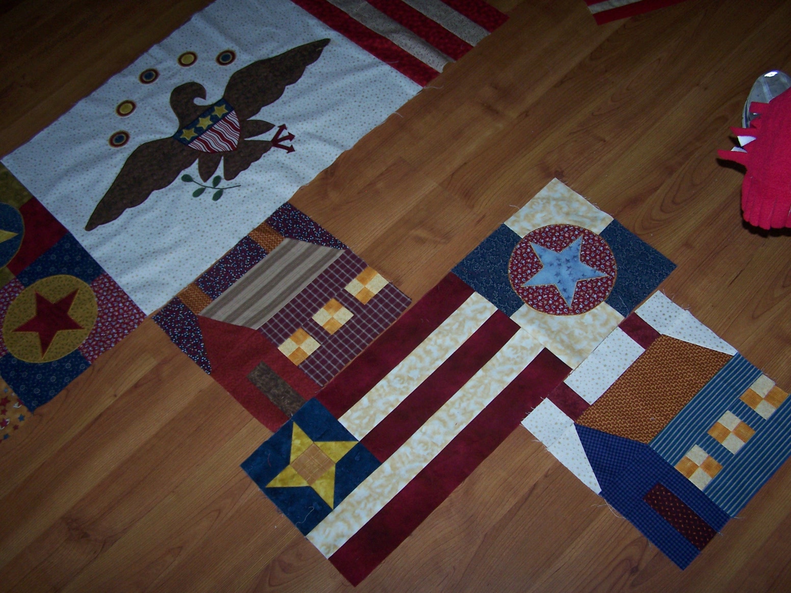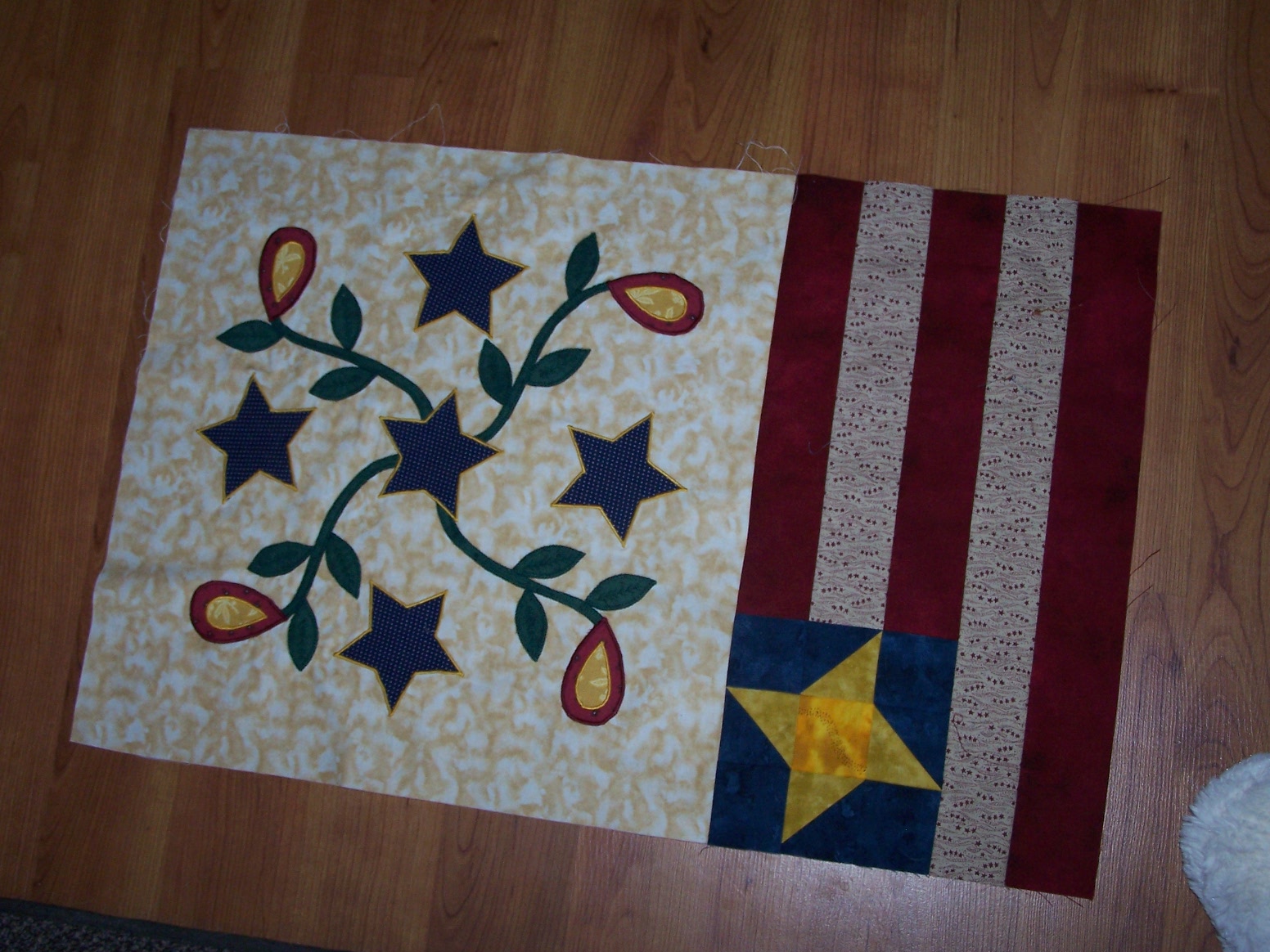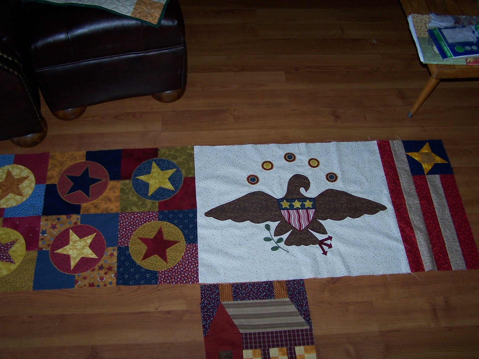 Going back to regularly scheduled programming, I did get my “homework” done for next guild meeting.  If you just started reading, our challenge project this year is to do a BOM of your own choice.  I’m making the Fons and Porter Patriotic Sampler as mine.  To get it finished in the allotted time frame, most months I have to do more than one block.  This month, I did the large eagle block, and the star/vine applique block.  I was also able to start attaching some of the blocks to each other.
