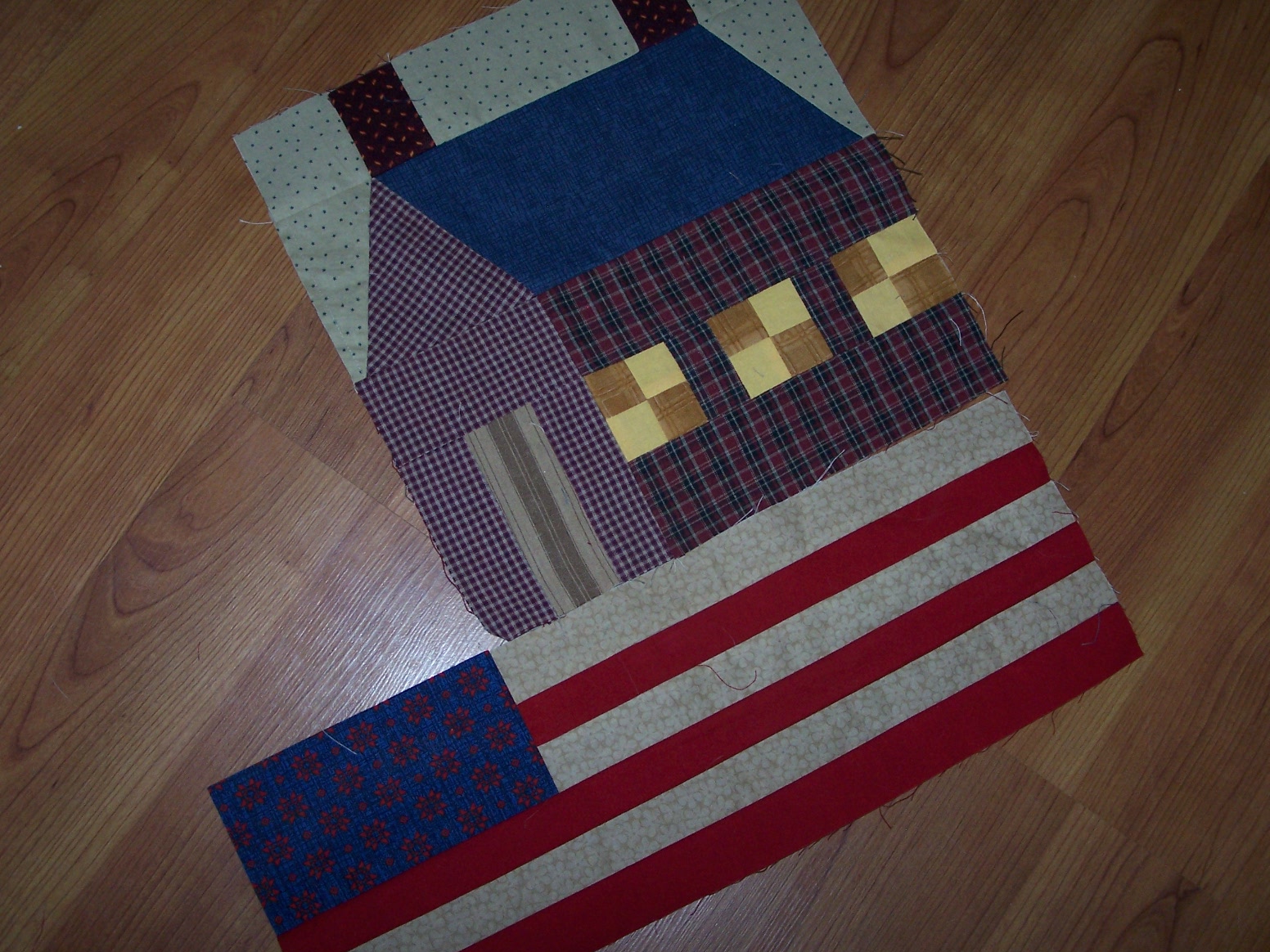 I deviated from the original pattern, twice on this row.  The original pattern calls for the eagle to be blue.  I wanted my eagle to be brown.  Also, the flag beside the eagle block is not like I sewed mine.  The original pattern has the star in the upper left corner, next to the eagle block.  That seemed “backwards” to me and my husband, so I flipped it for mine, and put it the way it would be if it were hanging down from a little flag pole.