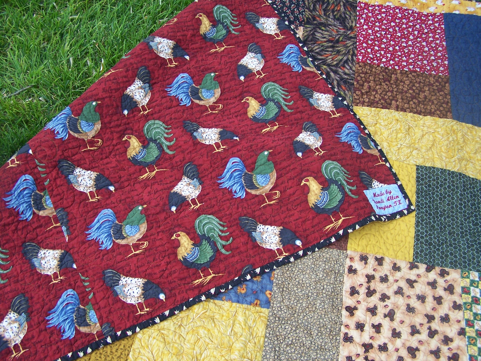 I finished my “chicken quilt”. Just a simple turning twenty made with mostly chicken themed fabrics, quilted with Willow Leaf studio’s Fancy This panto. I had everything but the binding finished close to two years ago, now. Now, it’s finally draped over the back of my sofa, ready to snuggle up in during the chilly Fall/Winter months. I actually took a little nap under it yesterday.