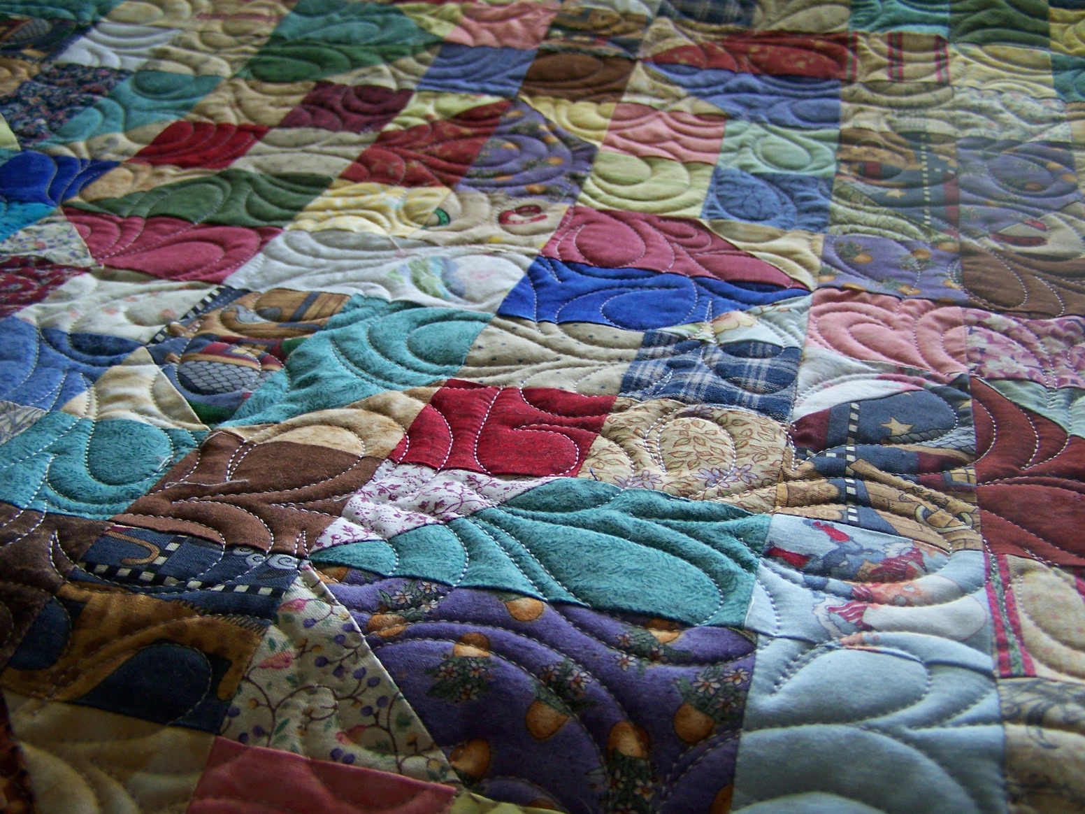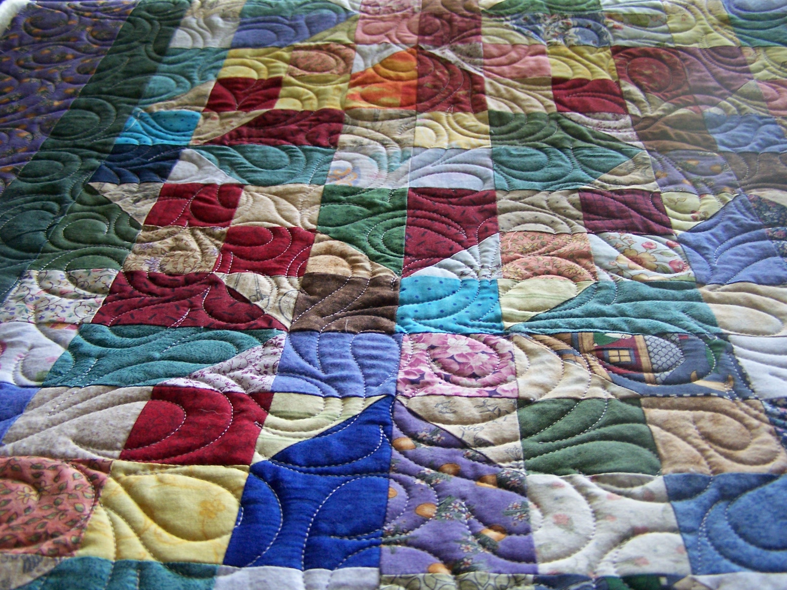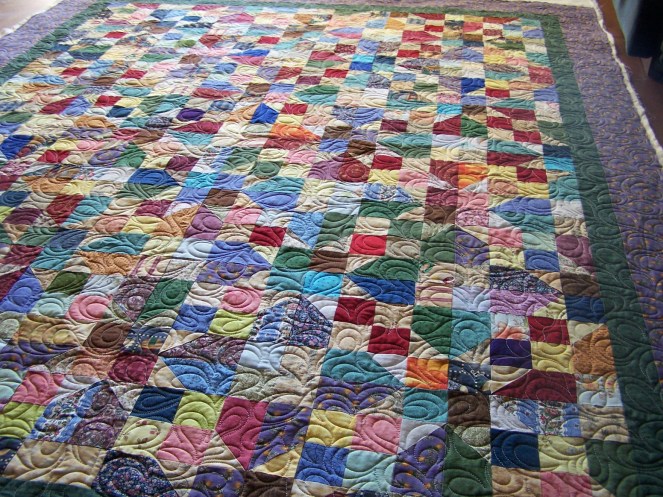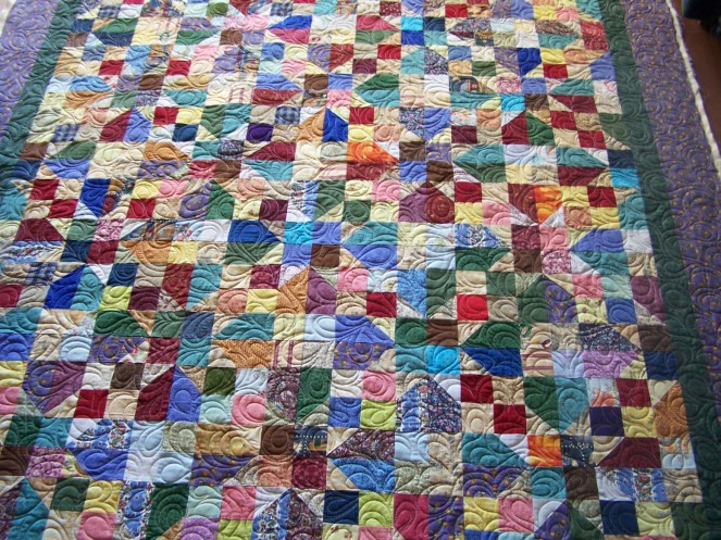 Last night I loaded the Oklahoma Backroads (pattern from Bonnie Hunter’s Quiltville) quilt that I started making for my Mom, back before she was diagnosed with lymphoma. So, I know this has been a WIP for over two years. I pulled it off the longarm just a little bit ago. It’s a scrap quilt, with pretty much bits and pieces of any and ever quilt I had previously made in it. I could have done a better job with the fabric values, which would have made the stars and “roads” stand out better, but she will love it for snuggling up in. It’s so busy that I decided to do a freehand “paisley-ish” allover meander on it, just to give it a nice texture. Also, being that I really avoided my longarm for over a year, and the year before that it was barely used, these little projects are a good way to sharpen up my skills again. I’m a little rusty and these are good confidence builders. I am pleased to report that my longarm just took right off, and is working perfectly, even after all that sitting, waiting for me to come back to her. That was a big relief.