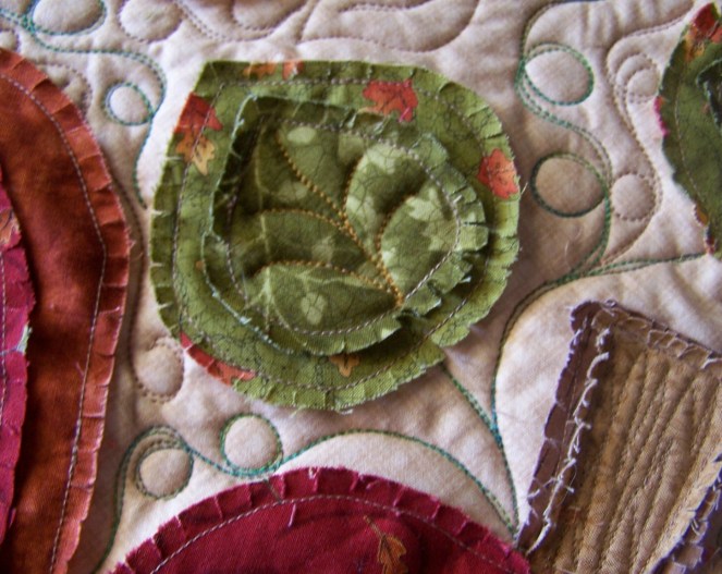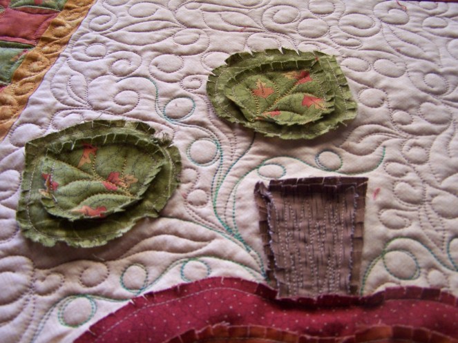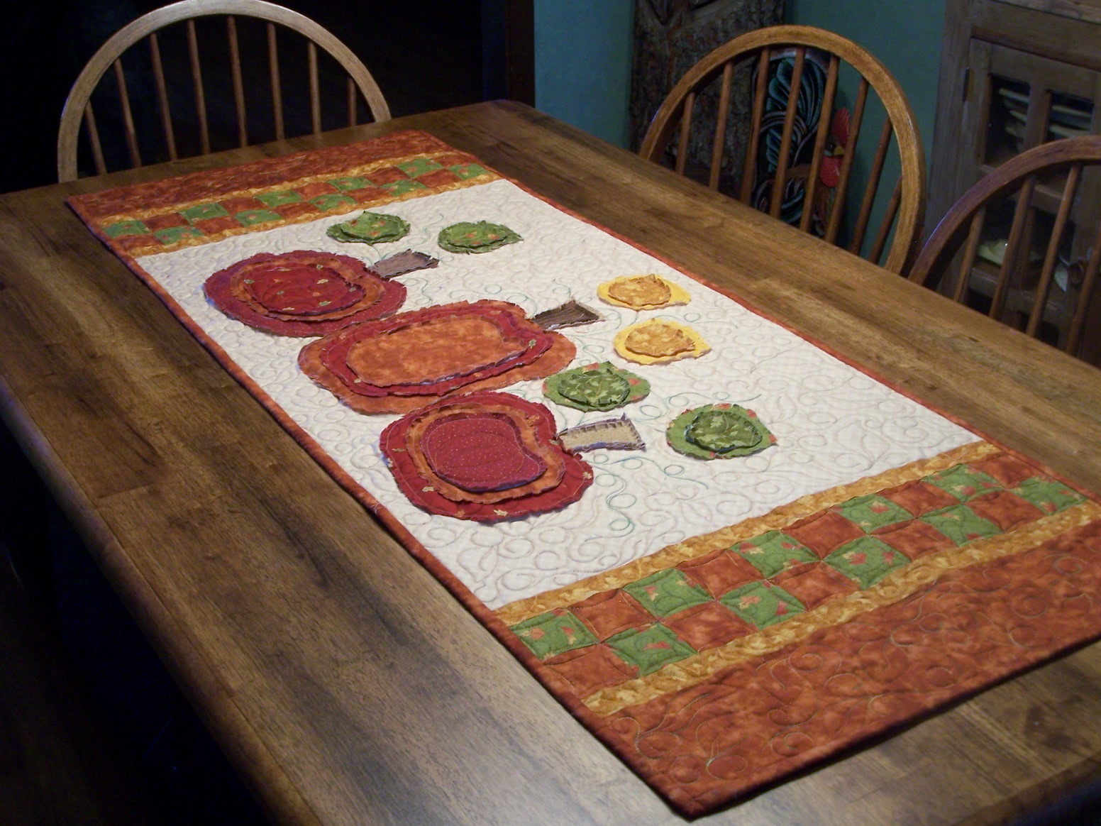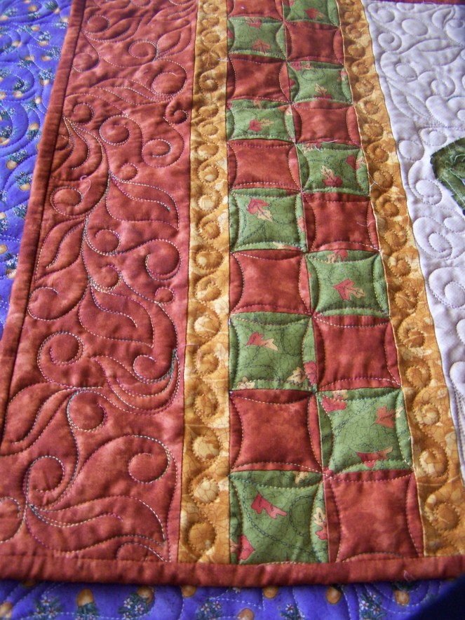 I pulled out a little pre-cut table runner kit I have had for probably three years now. IĀ bought it from Chery’s Quilt Corner, in Guymon. It was designed by Judy Rice. I am so happy to see it on my table in time for pumpkin season this year! I quilted it on my longarm. For the pumpkin vines that were supposed to be done by machine or hand embroidery, I just threaded my longarm with some green thread and did them as part of the quilting.