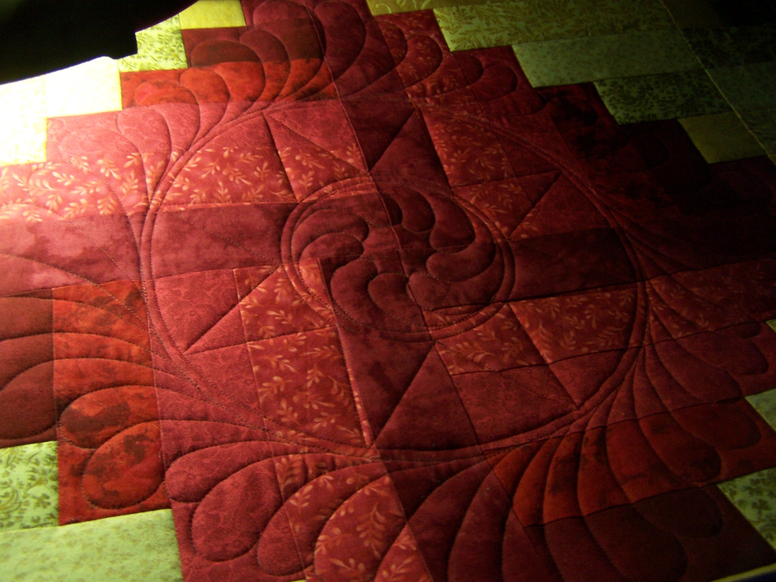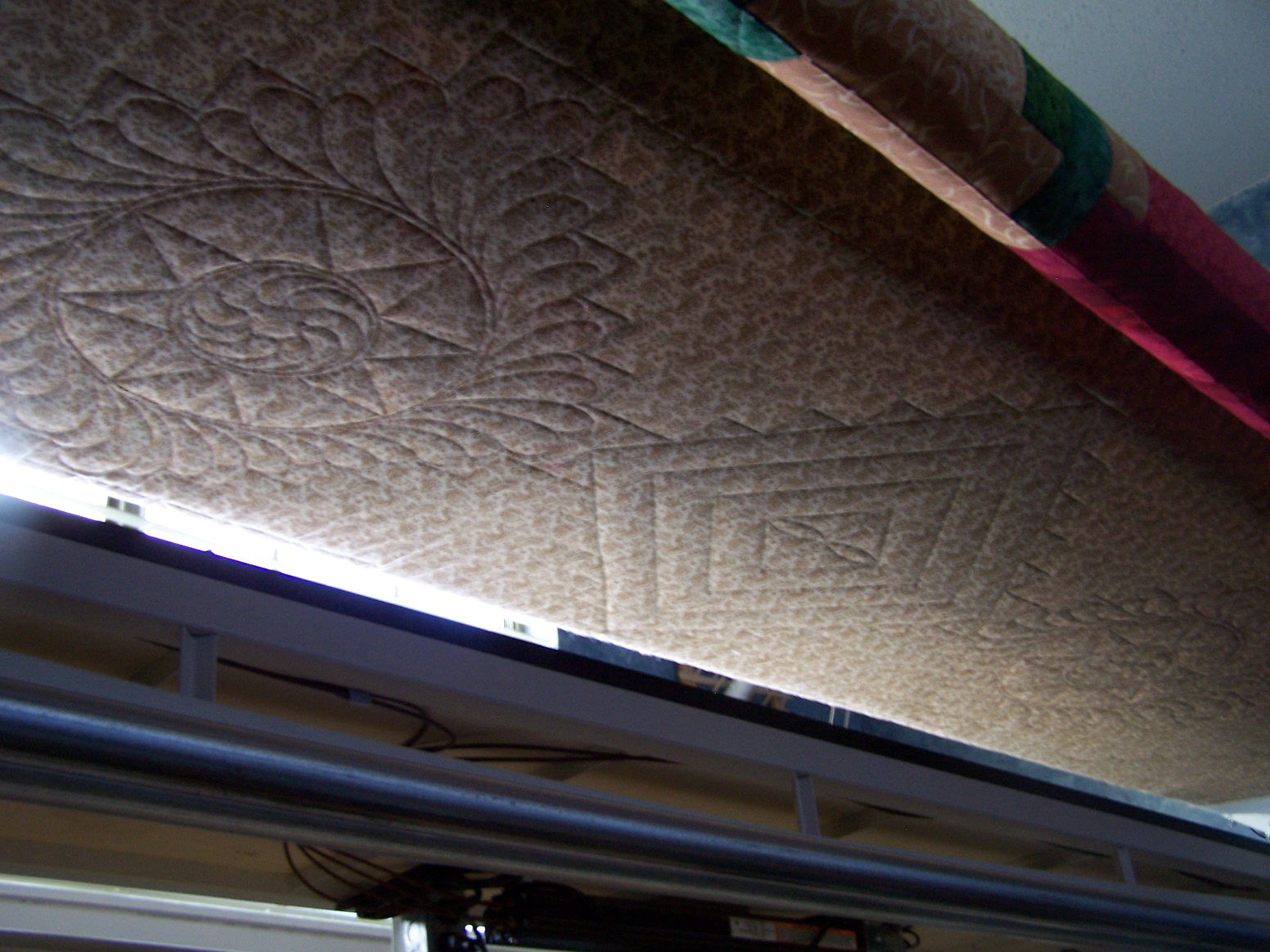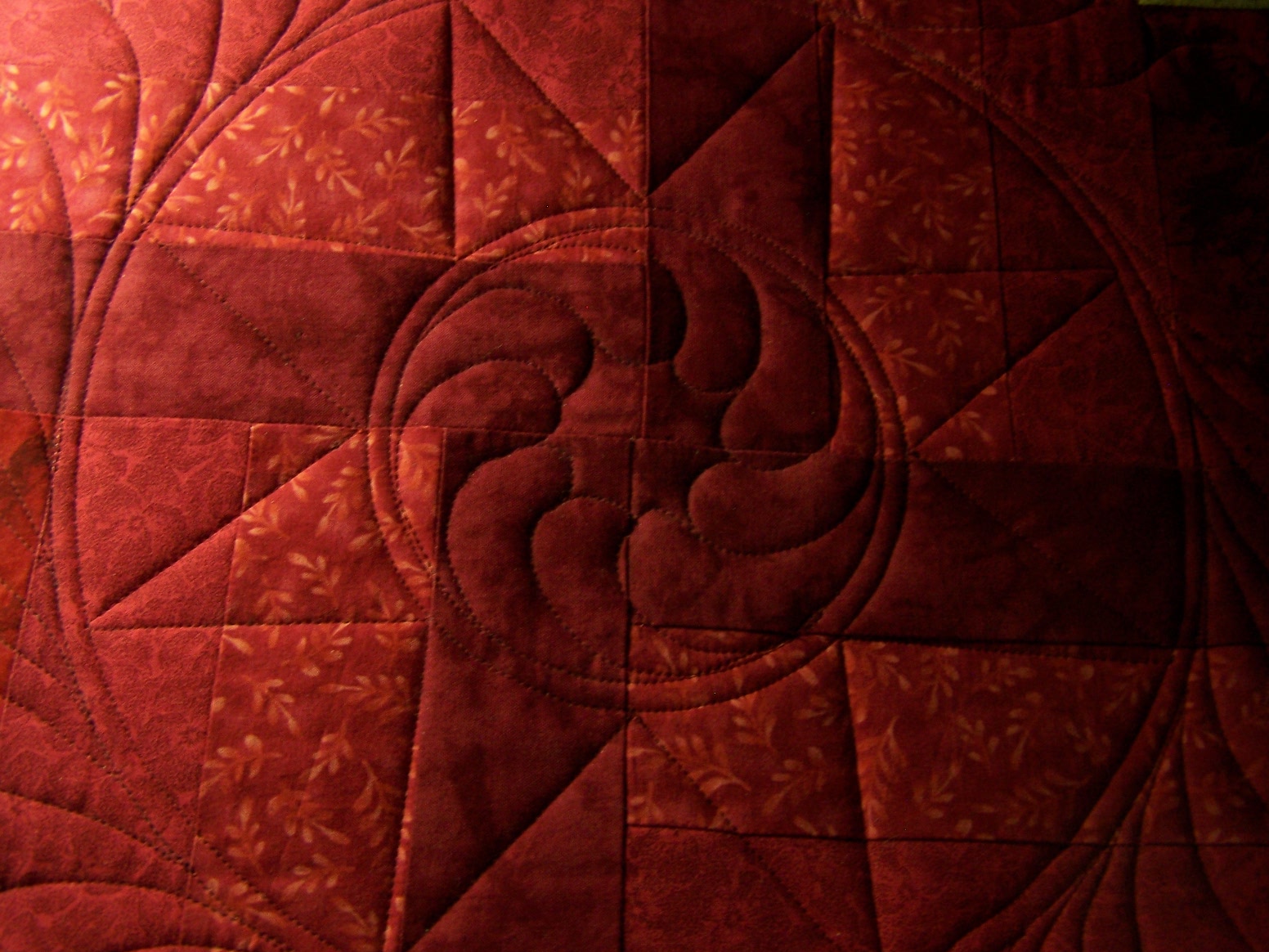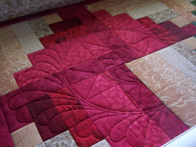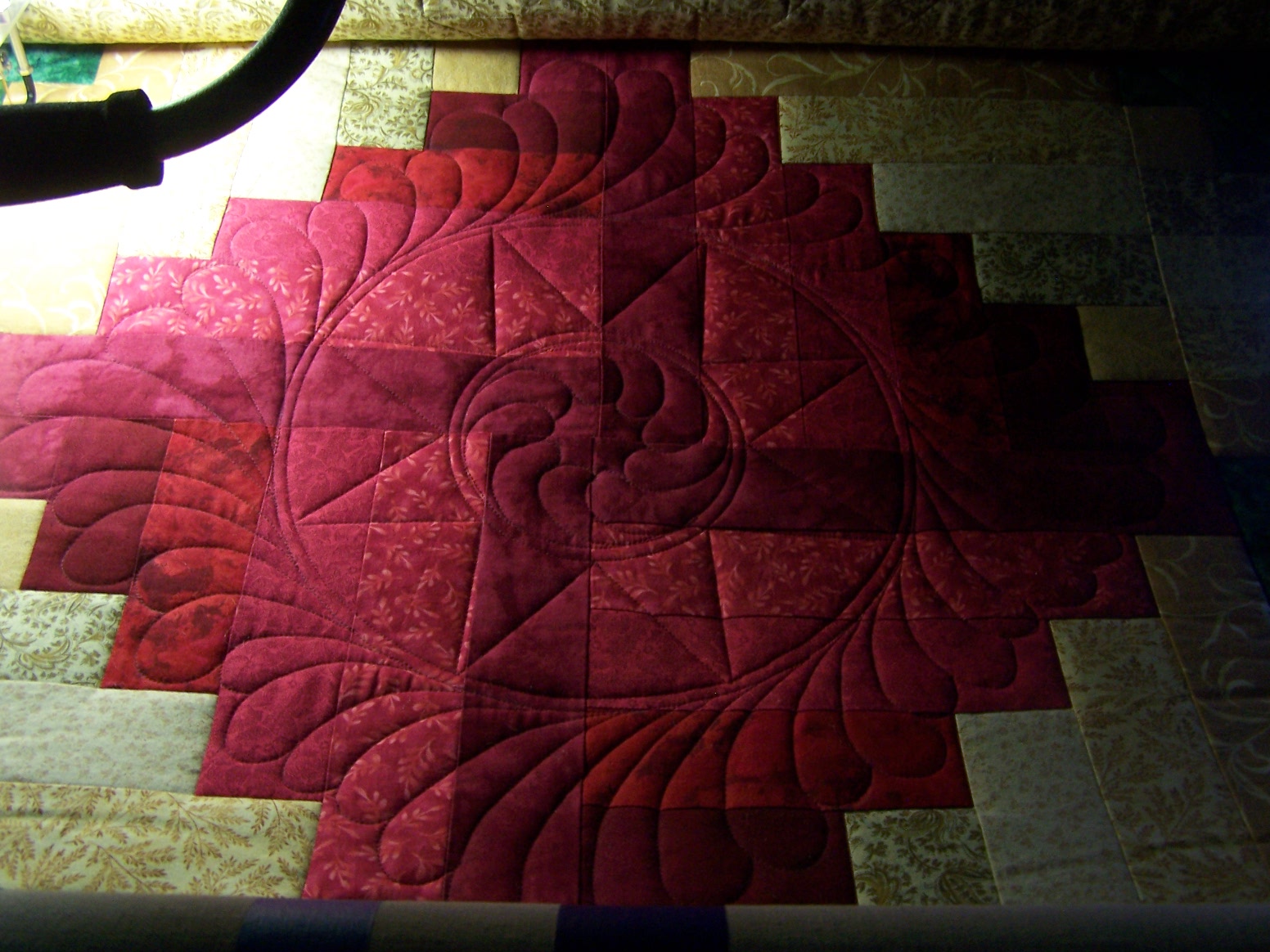 Here is a little snippet of some filler I going to use in some of the tan sections. I only did this one bit before going on to finish the ditch work and start the feathered star medallions. I just had to see if I liked the idea I had for it. I was trying to do something that would mimic the print in the darker tan fabric.