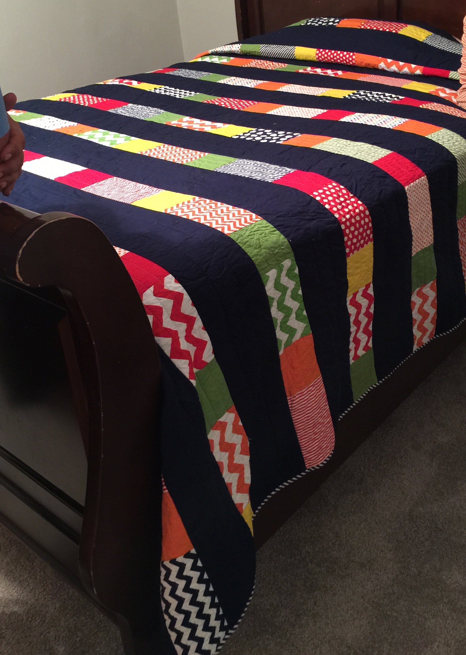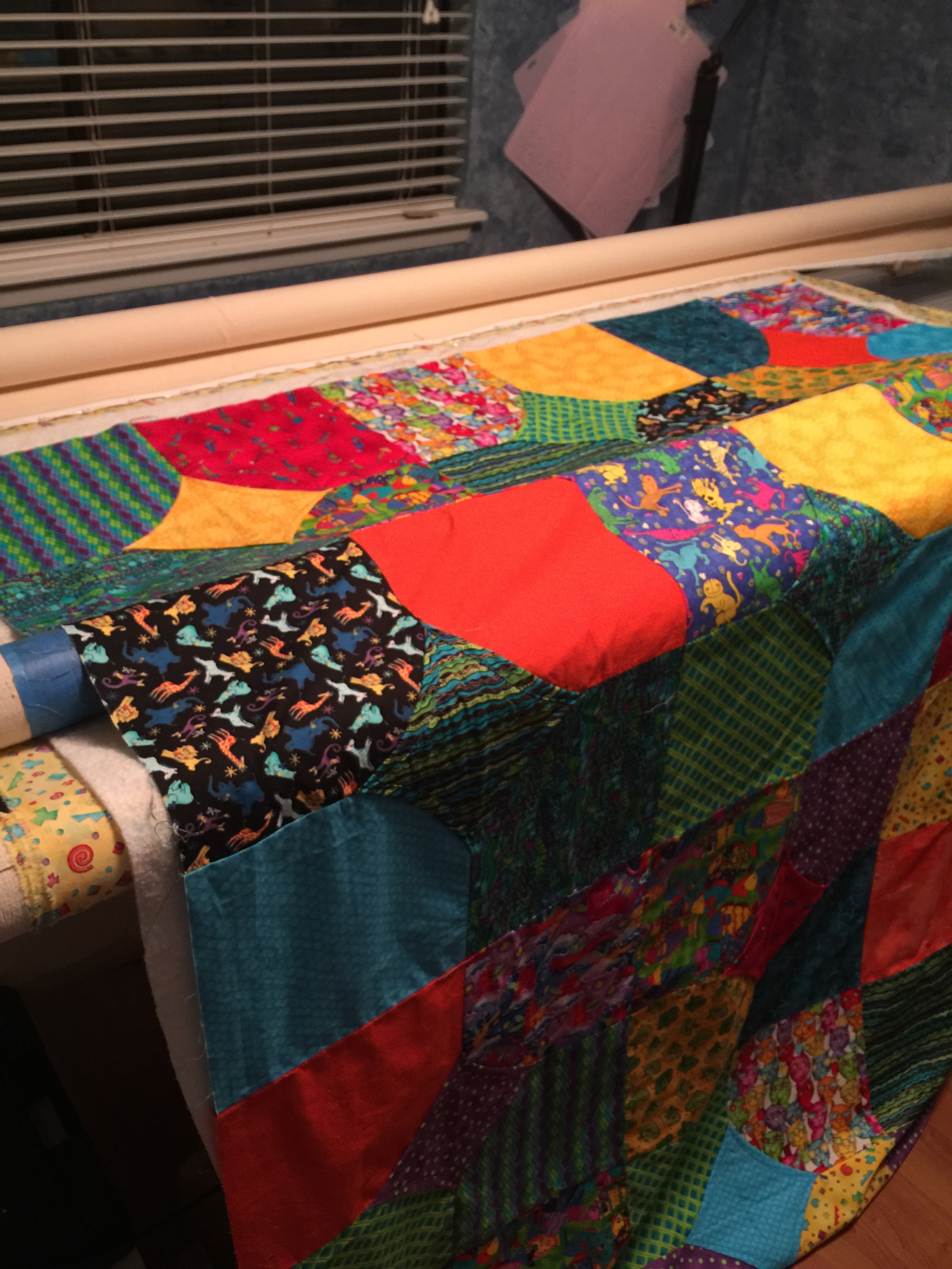 I did get the backing for baby Chase’s quilt pieced and loaded on the longarm this afternoon. I found a piece of leftover batting that is just barely, and I mean barely, big enough. I’m going to try to use it and hope I don’t regret my decision. If tomorrow goes as planned, I will finish loading it on the machine and get a bit of stitching done. I haven’t decided exactly what I want to do on it, but it should be a fun one to do!