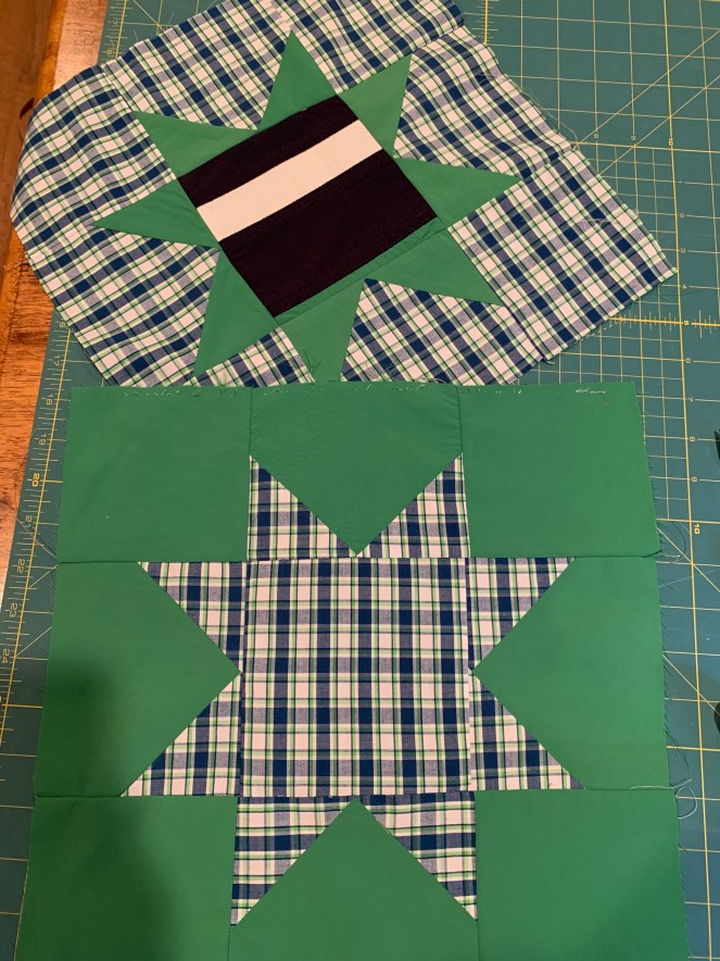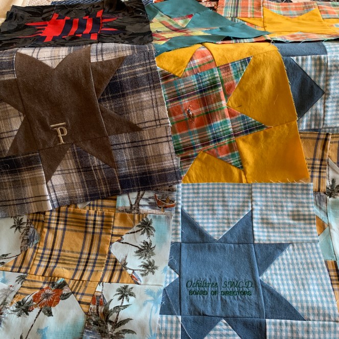 While the IQ was working away for me, I worked on piecing some more floating star blocks for a commissioned memorial quilt I’m making for a sweet lady that was recently widowed. Having lost a spouse myself, I know what this means to her. It’s going to be very scrappy looking, with a mix of fabrics from his shirts, a pair of shorts, and even some swim trunks. I am praying it all pulls together nicely in the end. This is such a special project.