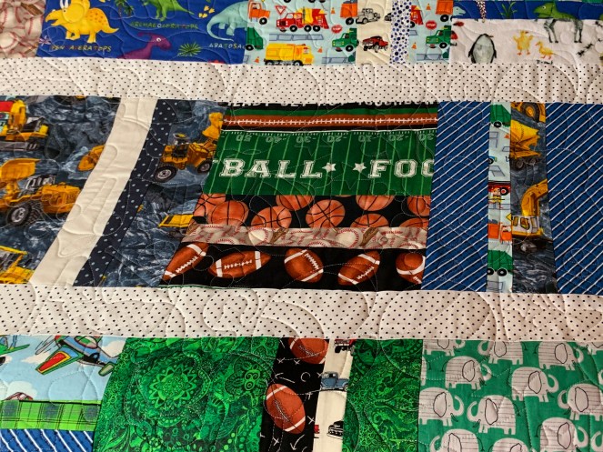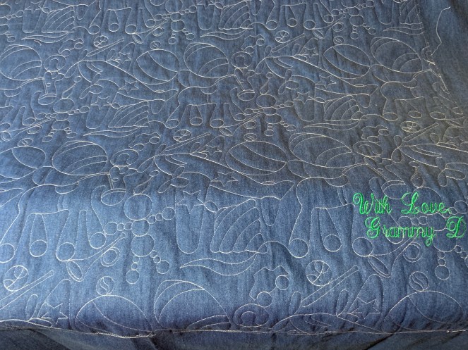 Wow! It’s been awhile since I did a Sunday Stitching post. But, I’m trying to get back in the blogging habit and I did some stitching today, so here we go. My Mister wanted to squeeze in one more day hunting before deer season closes on the 15th, so I had the house to myself. I did quite a bit of multitasking. After over a decade of longarm quilting, I finally took the plunge and added an Intelliquilter computerized system to my A1 quilting machine. I am loving being able to stitch out an edge to edge while doing piecing work on another project at the same time. I used a panto called Toys from It’s a Quilt Thing to quilt this cute client baby quilt. It stitched out so nicely. My client brought me a denim quilt back with this one. That was a first for me and I was a bit concerned about having tension or thread breaking issues. Not one bit of trouble! My trusty A1 handled it just fine.