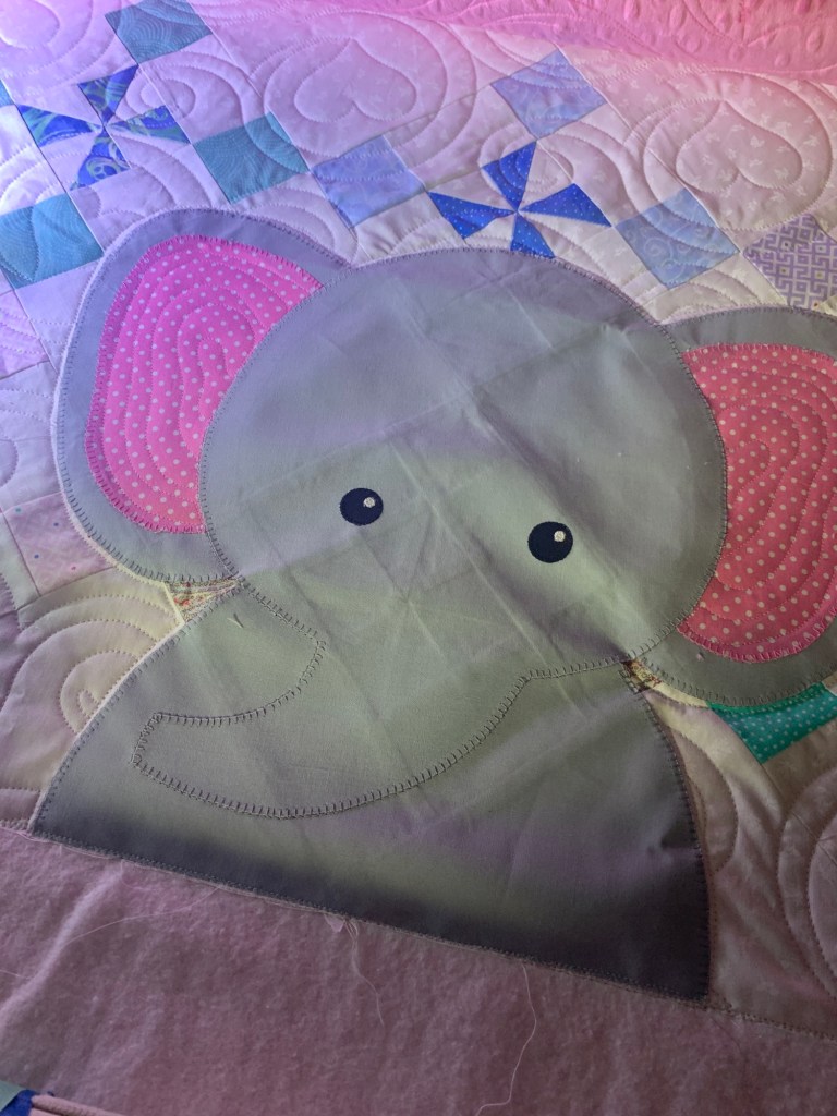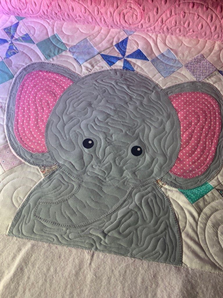 Yesterday, I got to quilt this adorable little baby quilt for a client. She requested edge to edge, except for the elephant. So, I set up a no sew zone around it and then added my interpretation of wrinkly elephant skin texture. 😄 So much fun!