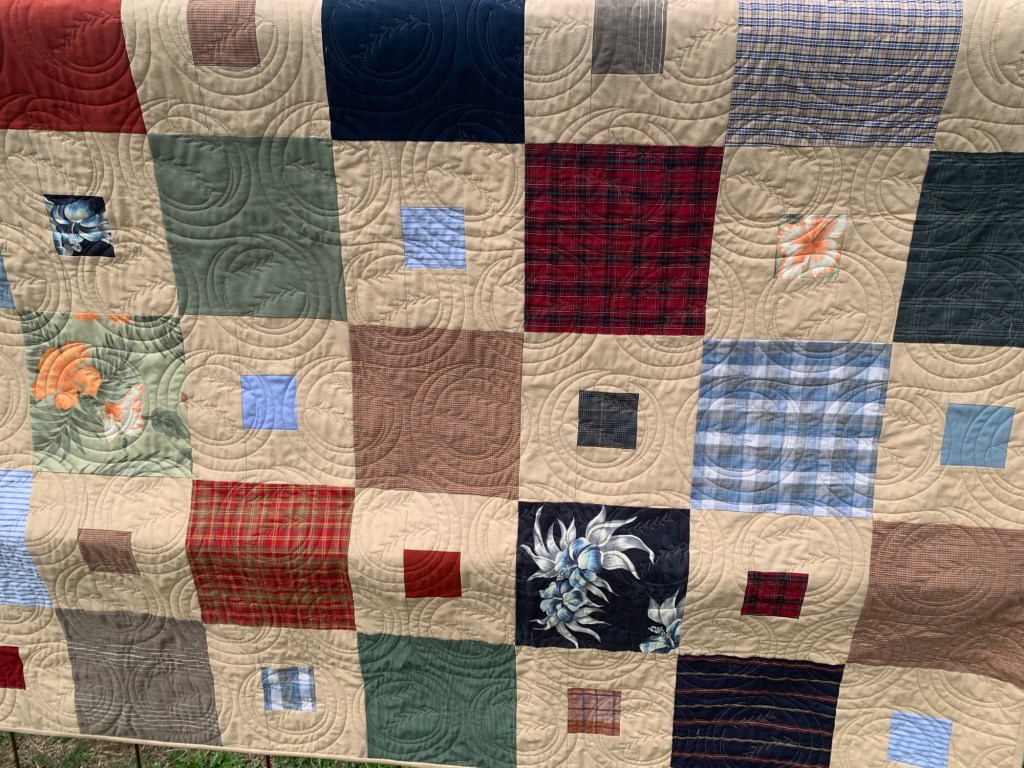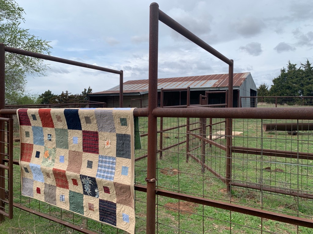 I am hand finishing the binding on one of the quilts I’m currently working on, so it went along on the trip to the ranch Thursday so I could stitch during the drive. It’s a commission for a dear friend, pieced from her late father’s shirts, and a neutral fabric I purchased for the sashing. They are huge baseball fans, and we found a digital baseball pattern for the quilting. Even though the binding isn’t completely stitched, I went ahead and got some pictures of it while we were there, as it will be shipped off to her this next week. I don’t take on many commissions, as I have a huge bucket list of my own that I want to make, but there are some that I just cannot turn down. I love that I’m able to make something for my friend that will bring her comfort and be a treasure to her. After all, that is one of the best things about being a quilter, isn’t it?