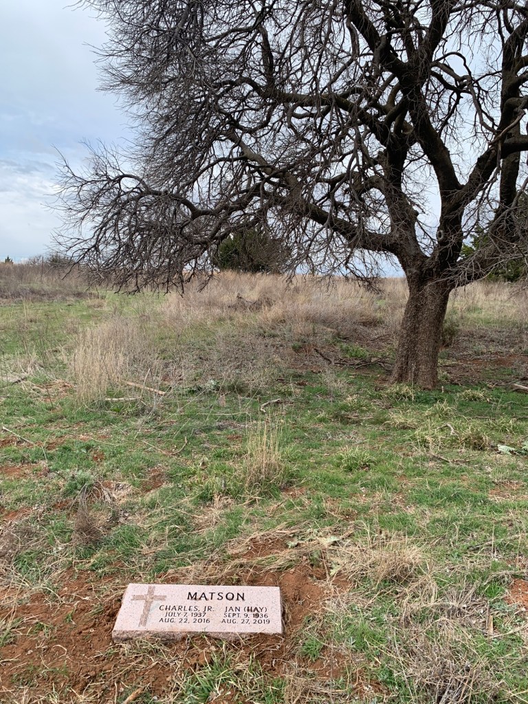 I was so tired when we got home from the ranch last night, but it was the good kind of tired. My husband, brother and I made the 2.5 hour trip to the monument company to pick up the marker for my parents’ gravesite, then the one hour drive from there to the ranch to place it. My cousin Dee came over from his home and we all had a nice visit and talked about some other ideas to spruce it up a bit. This is where Mom wanted to be buried. Many times over the years, she would say to us “cremate me and stick me under the hackberry tree”. I’m so glad we were able to fulfill those wishes. I think she would have been happy as can be with just the large rock from the ranch marking the site, but I really wanted a proper marker.