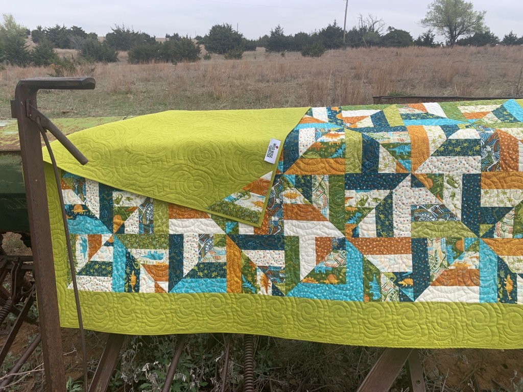 I went to the ranch to check on Cookie, my very pregnant cow, due any time to have her first calf. She was happily grazing with the rest of the herd, which belongs to my cousin. While there, I got some pics of this finished Strip Mirage quilt I made for my great-nephew. The pattern is free from Sew Yeah Quilting. You can find a video tutorial on YouTube, along with a link to the printable pattern. It’s a fast, fun jelly roll pattern. I chose to buy some coordinating Bella solid fabric and add some size by adding borders. The jelly roll is Stomp Stomp Roar from Stacy Iest Hsu for Moda.