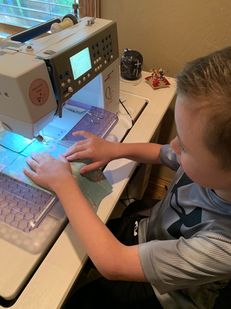 I have been very busy this past week. It was a good week, just busy. I started and finished a custom quilting job, but it’s going to a guild challenge, so can’t share just yet, tho I doubt any of the guild members are reading this. Probably better safe than sorry. I started yet another project. I can’t seem to stop starting fun new projects before I finish others. This was the absolute high light of my quilting week…one of my sweet grandsons wanted to do some of the sewing on this latest project I had going. I have been wanting to try the fold and sew method of making blocks with a layer cake and charm square pack. I chose the Strawberry Lemonade collection from Sherri McConnell and Chelsi Stratton. Here is my little helper at work.
