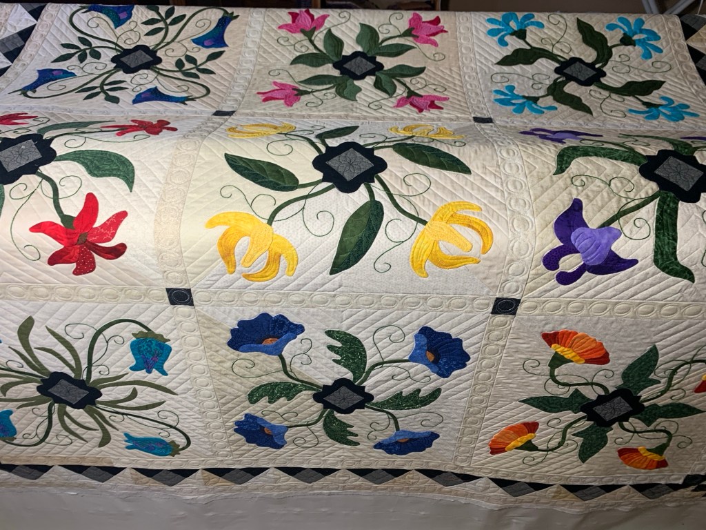 I mentioned a few days ago that I would have some exciting news to share soon regarding a client quilt. Every year, the Ogallala Quilters Society hosts the Ogallala Quilt Festival in Dimmitt, TX. It’s a prestigious show and I have some clients that enter something every year. This year one of the quilts I collaborated on with a client won a first place ribbon in its category. I was so excited when she texted me saying “we won first place” on her Vintage Dreams quilt she entered. The category was Mixed Technique, wall hanging. Anyway, its just so fun and exciting to see a ribbon hanging on any quilt you had a hand in finishing! This totally made my day when I got the news. I didn’t want to share pictures until after the show. Congratulations, Cynthia Shattles on your blue ribbon! What a privilege to get to do the quilting on a stunner like this!