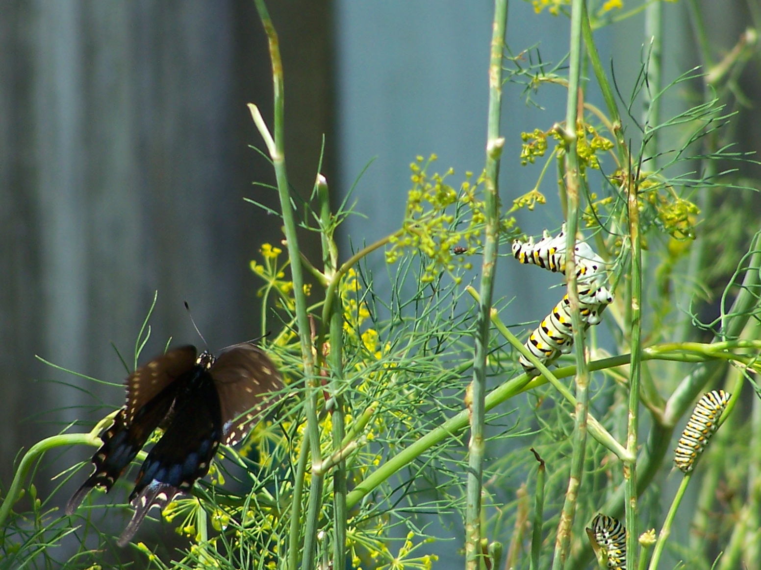 I know that Carla R., Jan & Michelle will especially love this next part. I got pics of a beautiful Swallowtail butterfly, laying more eggs, I think, on my dill yesterday. This is what the caterpillars will eventually turn into. I’m getting concerned that my dill supply is not staying up to the rate of demand. I planted more but it isn’t coming up too good. I was thrilled to finally get some butterfly pics.