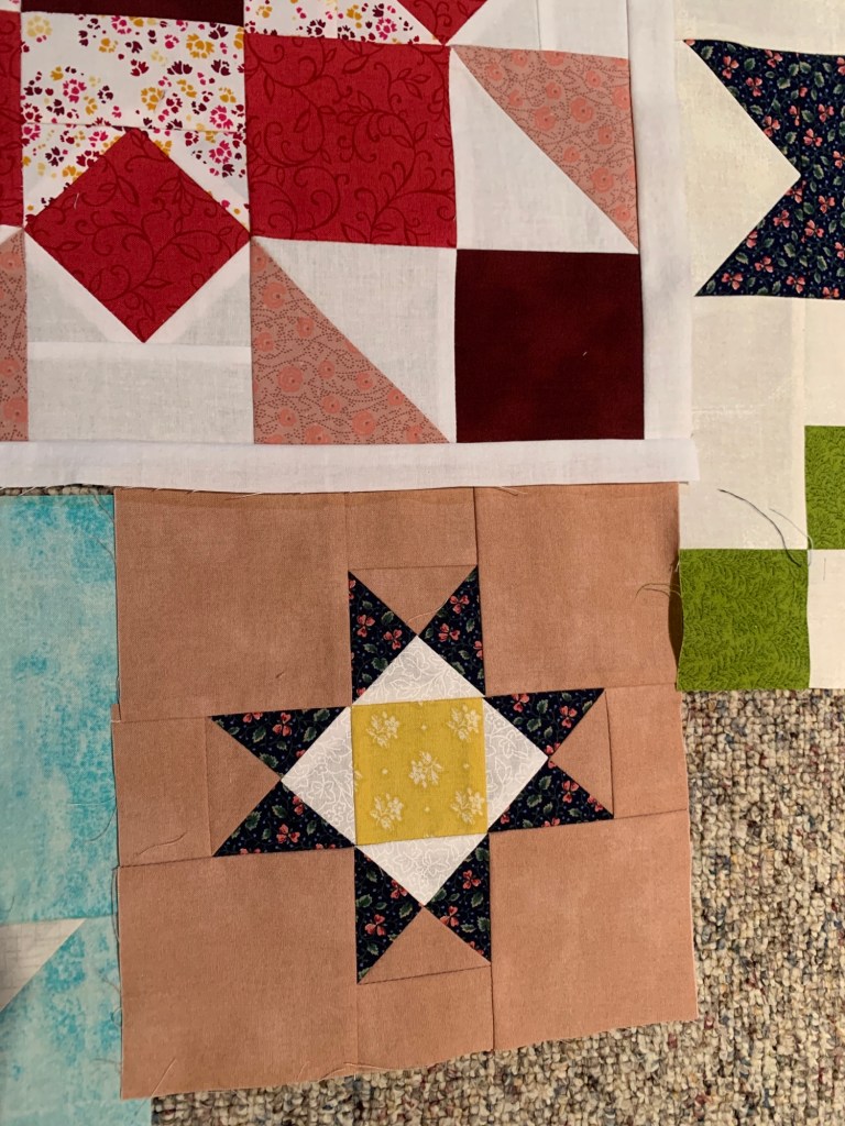 One thing that frustrates me is that this one fabric isn’t photographing the way it looks to the naked eye. At least not the way it looks to mine. The fabric in the background of this smaller block looks like a nice dusty rose pink, very similar to the pink in the large block next to it, but in photos, it has an orangish or brownish tint, and just looks kind of yuck next to the other blocks. I’ve tried all different kind of lighting, and it doesn’t look good in any photos.