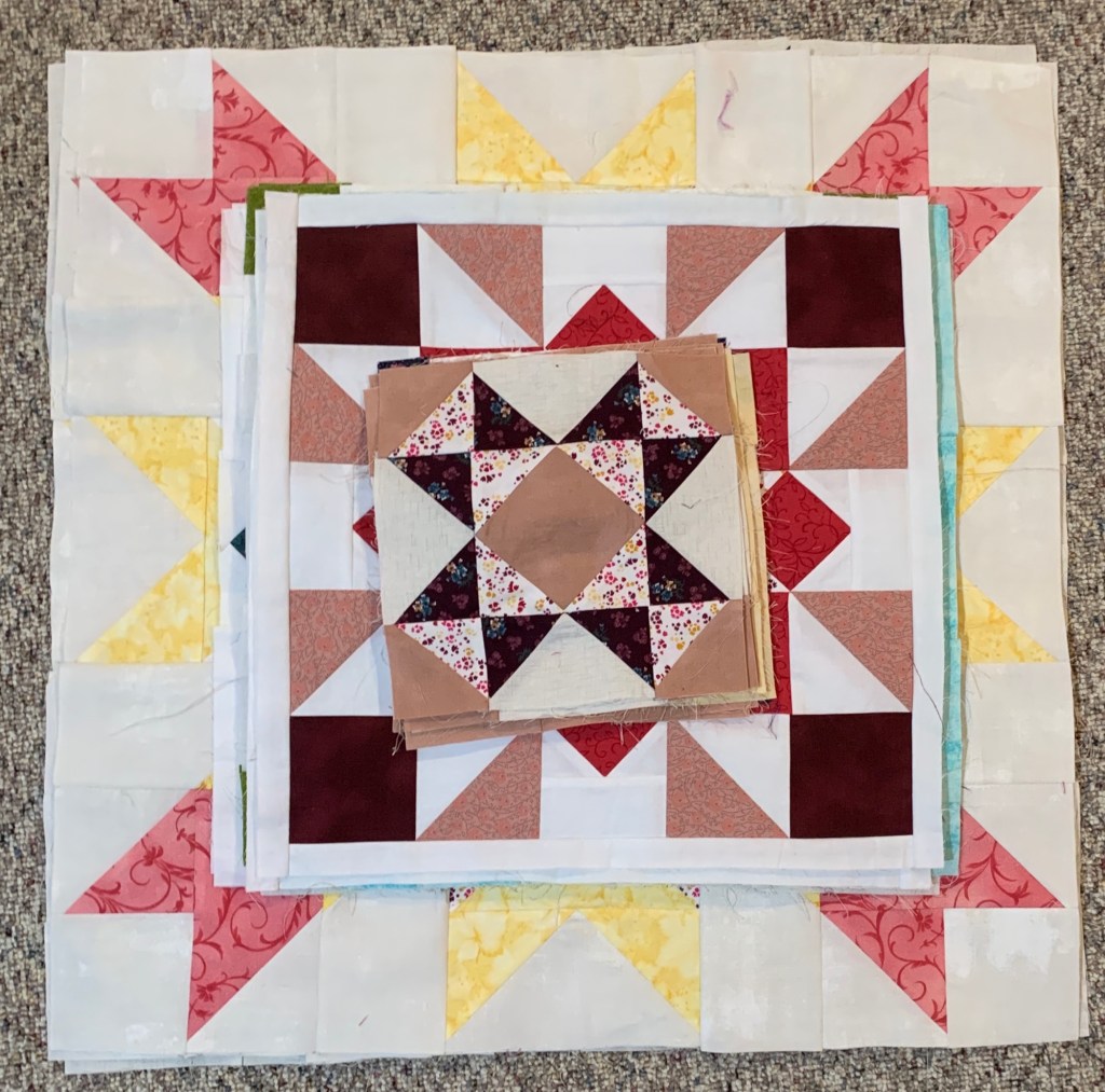 Finally, here it is again on top of the whole stack of blocks. It really makes me wish I had used a different fabric for the blocks I used it in, but I’m not going to remake them. Especially not since they look good enough in person. 🤷🏻♀️